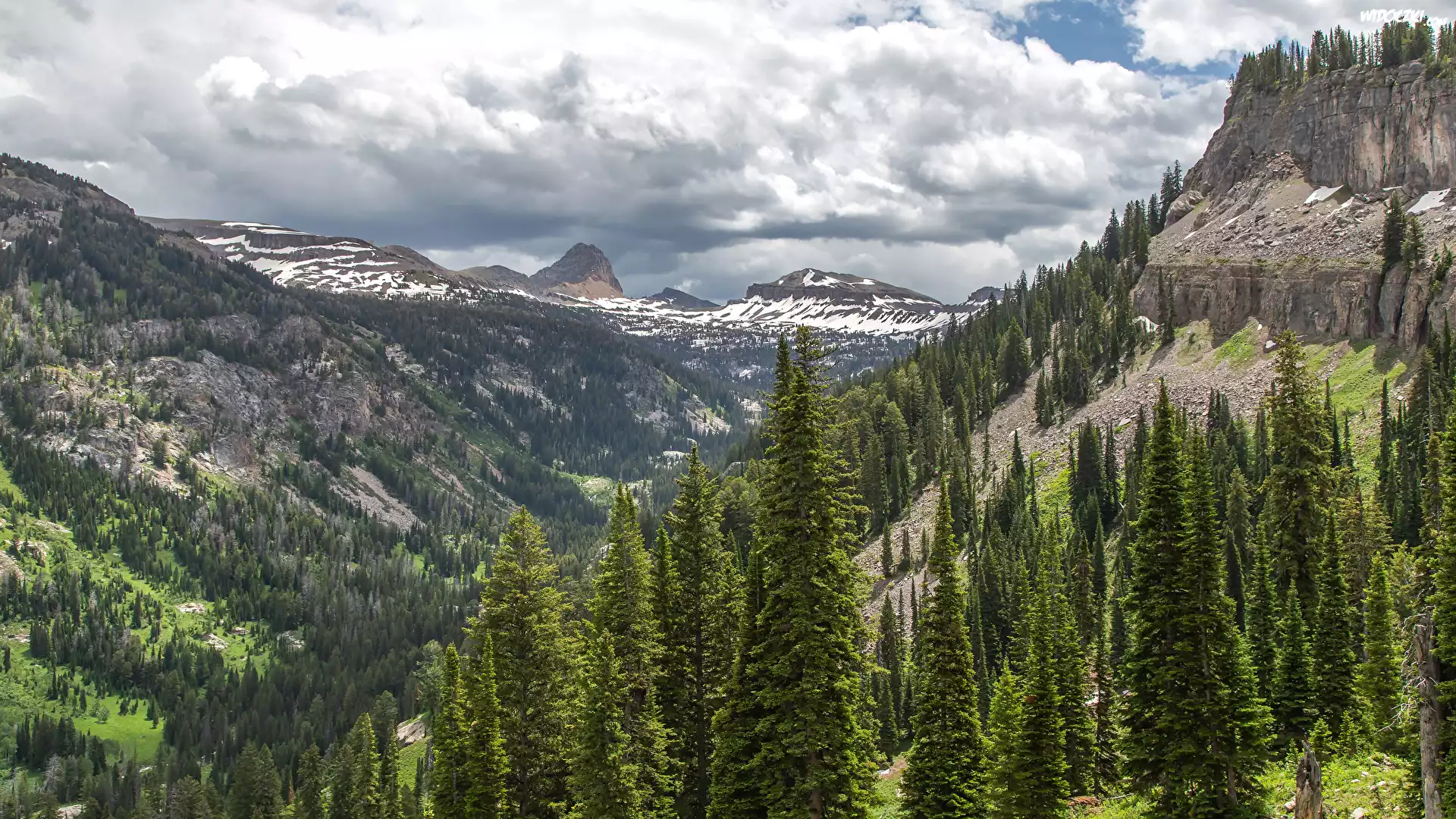 Zdjęcia, Góry, Las, Caribou-Targhee National Forest, Świerki, Dolina, Chmury, Stany Zjednoczone