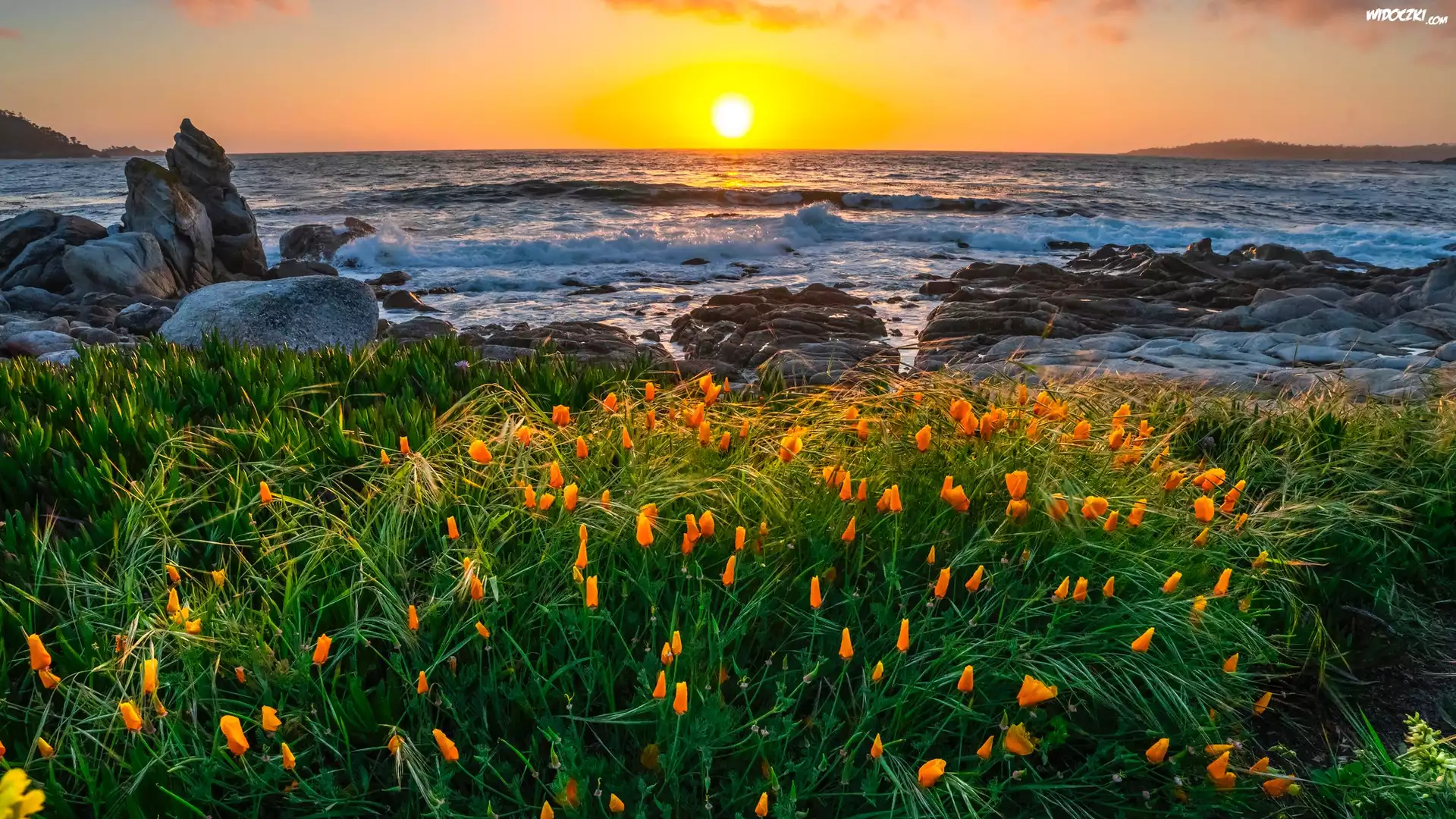 Stany Zjednoczone, Kalifornia, Półwysep Monterey, Zatoka Carmel, Morze, Skały, Łąka, Kwiaty