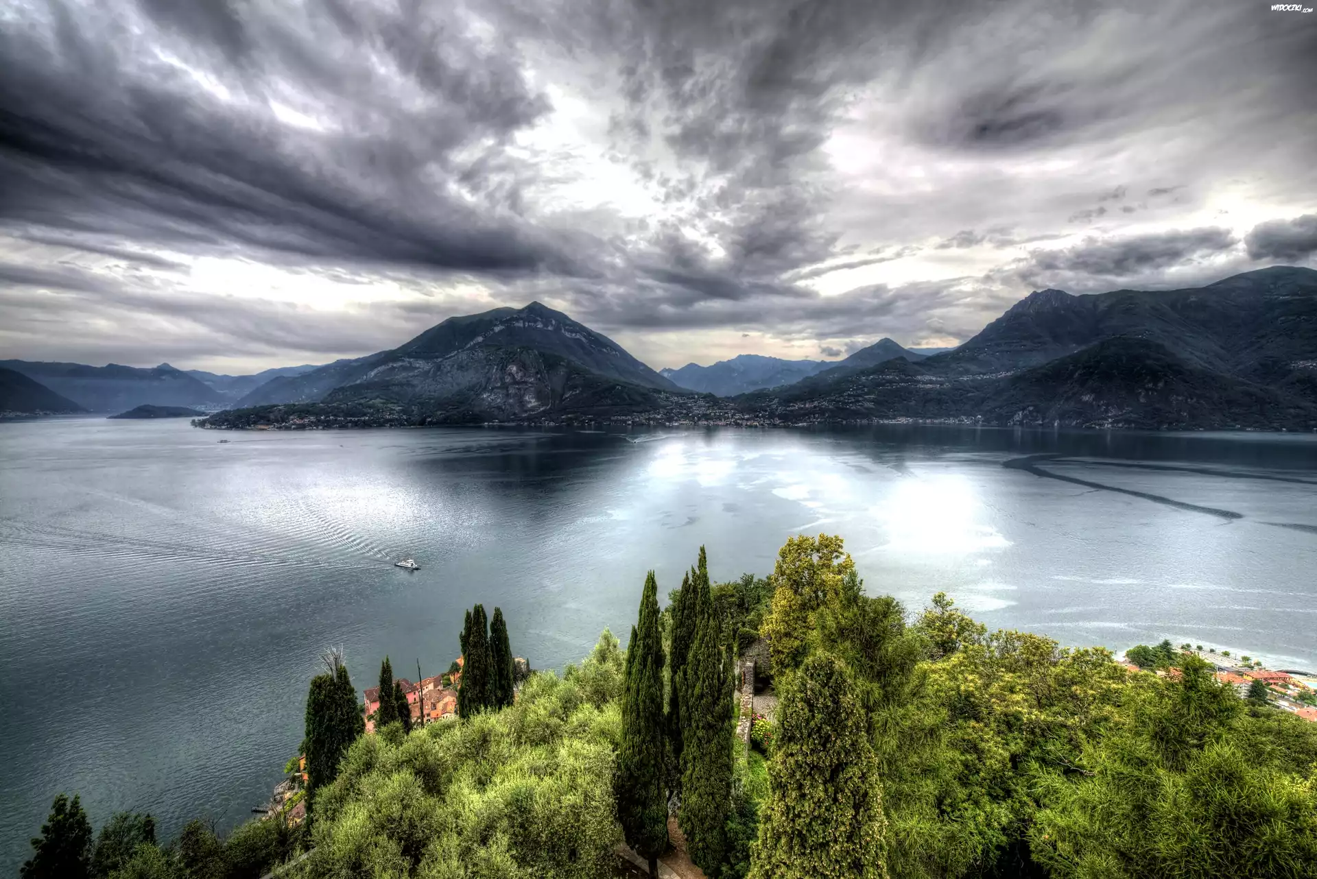 Włochy, Castello, Di, Vezio ,Góry, Jezioro, Drzewa, Chmury