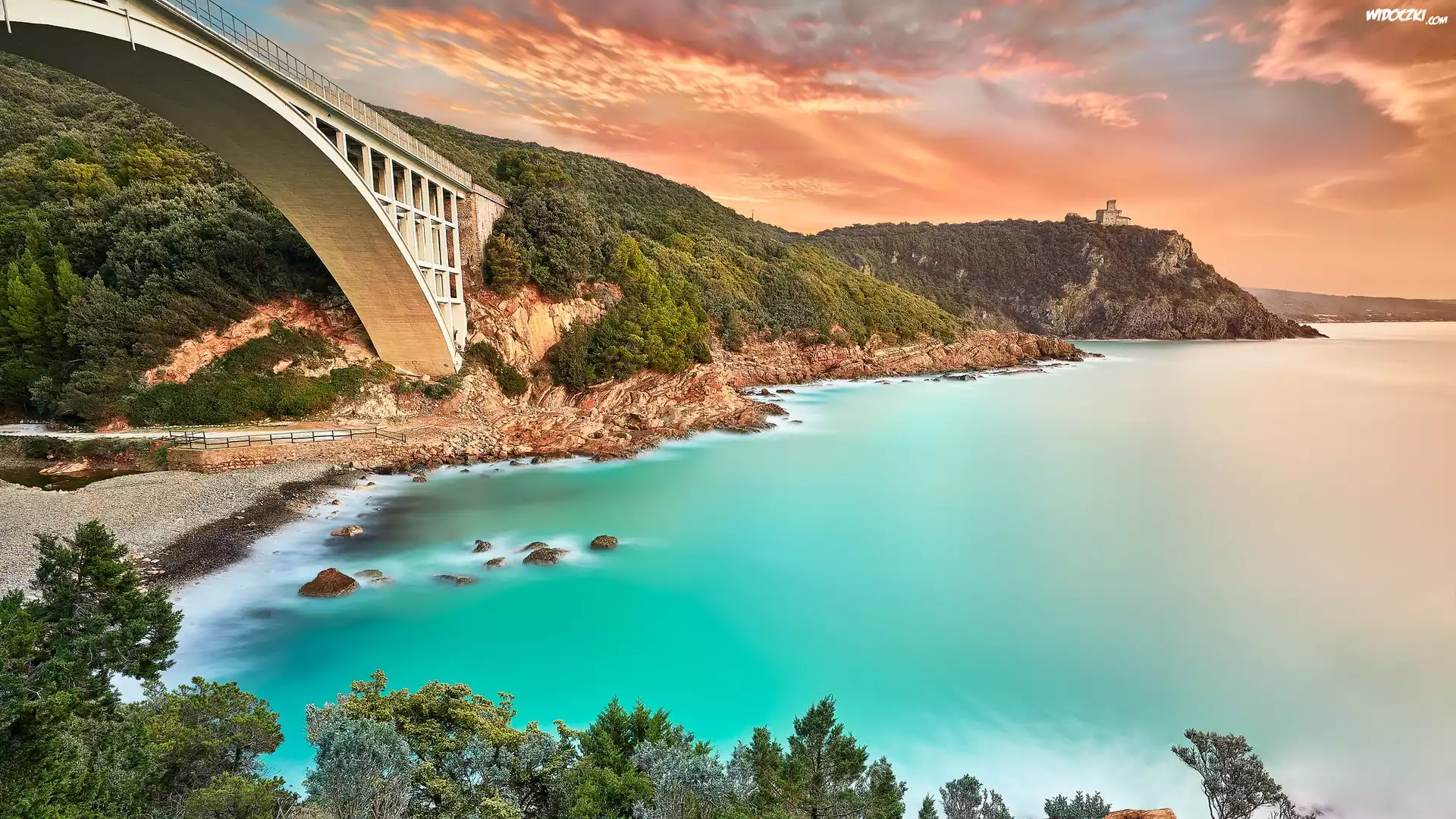 Zatoka, Most, Skały, Roślinność, Zamek Castello Sonnino, Wybrzeże, Morze Liguryjskie, Livorno, Włochy |