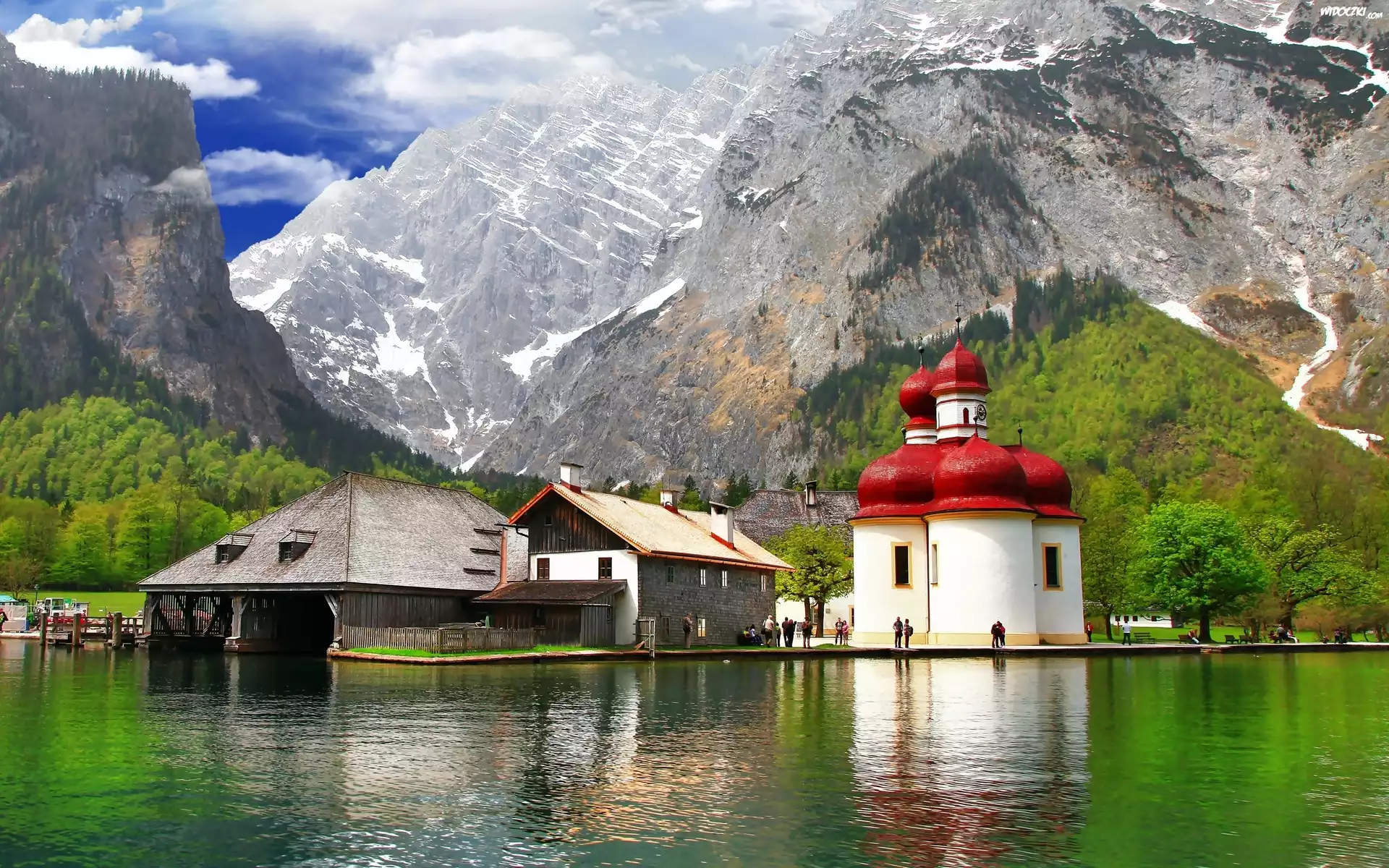 Góry, Jezioro, Koenigssee, Kościół, Św.Bartłomieja, Bawaria