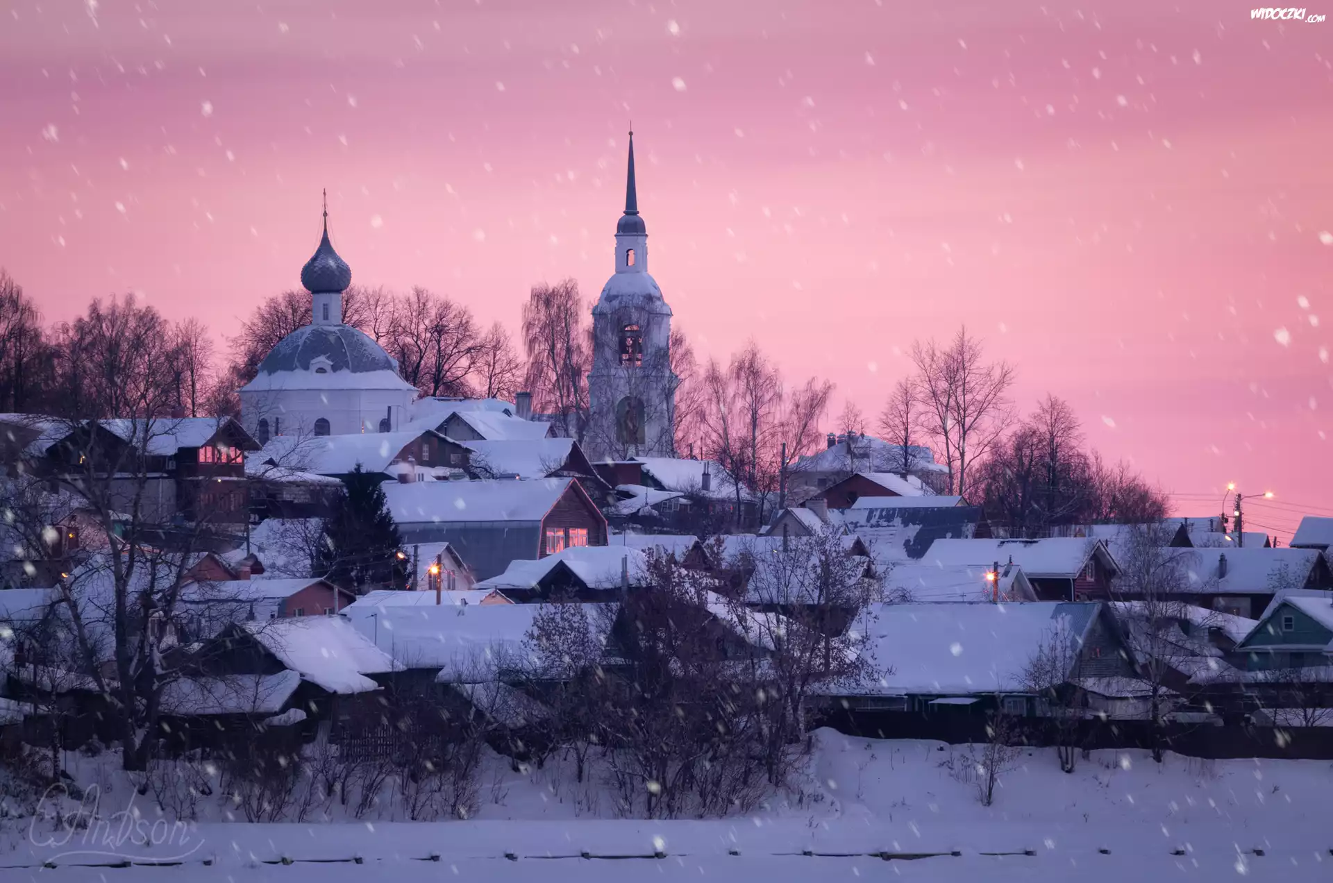 Domy, Cerkiew, Drzewa, PadajÄ…cy, Åšnieg, Zima, Kostroma, Rosja