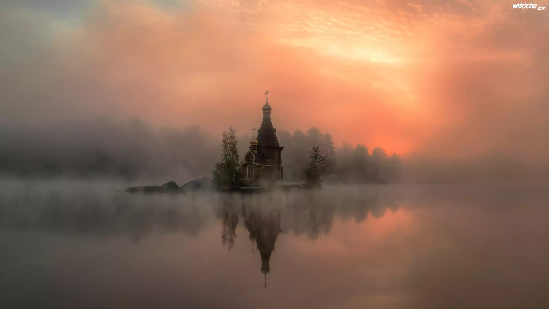 Rosja, Obwód kaliningradzki, Rzeka Vuoksi, Cerkiew, Świątynia Andrzeja Apostoła - Andrej Pierwozwanny, Mgła |