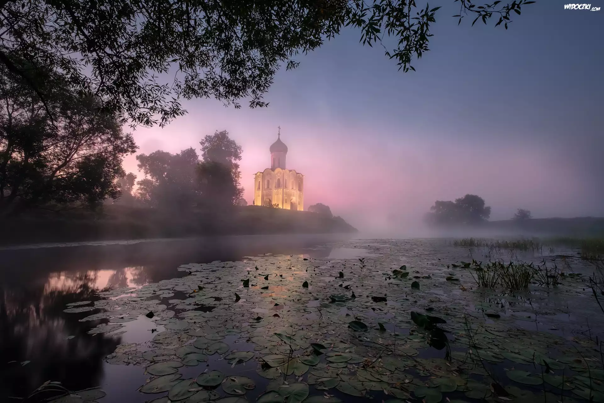 Cerkiew Opieki Matki Bożej, Rzeka Nerl, Mgła, Wschód słońca, Drzewa, Rośliny, Bogolubowo, Obwód włodzimierski, Rosja |