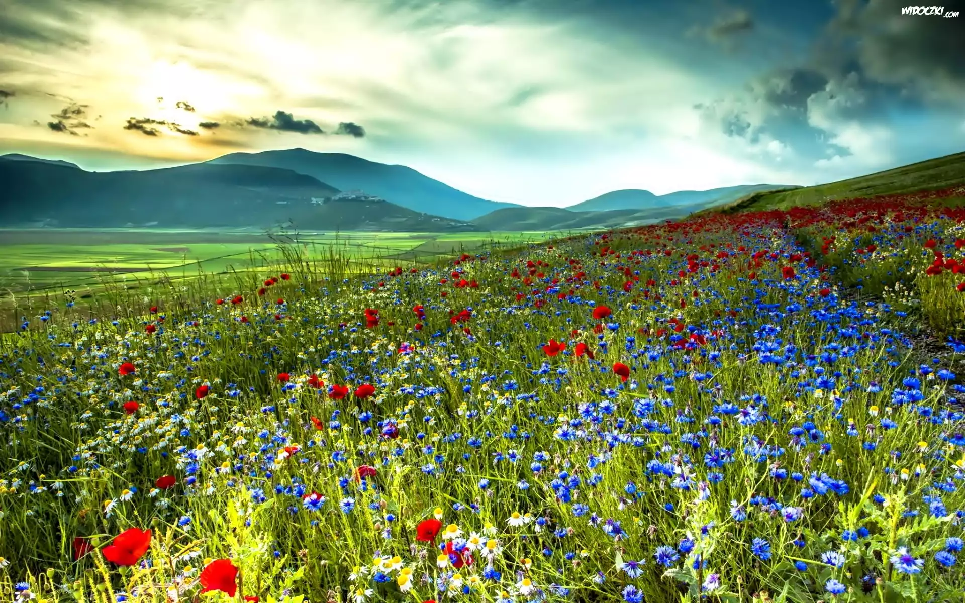 Zdjęcia, Łąka, Góry, Maki, Chabry, Rumianki
