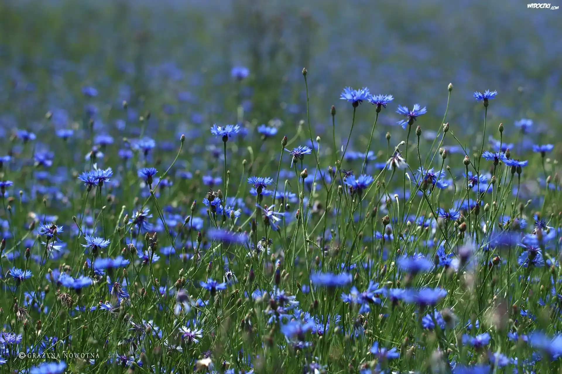 Zdjęcia, Chabry, Niebieskie, Kwiaty, Łąka