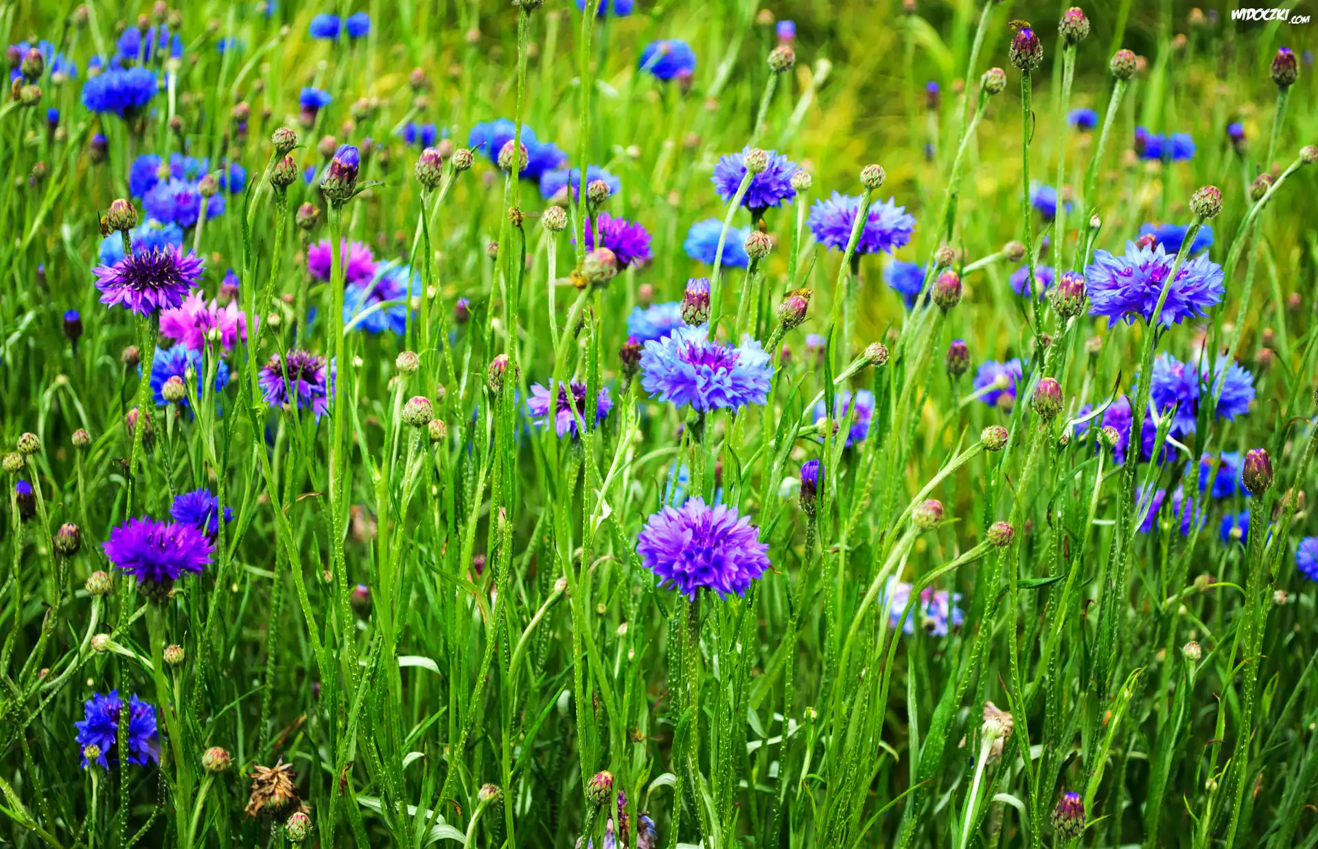 Zdjęcia, Kwiaty, Chabry, Niebieskie, Pąki, Łąka