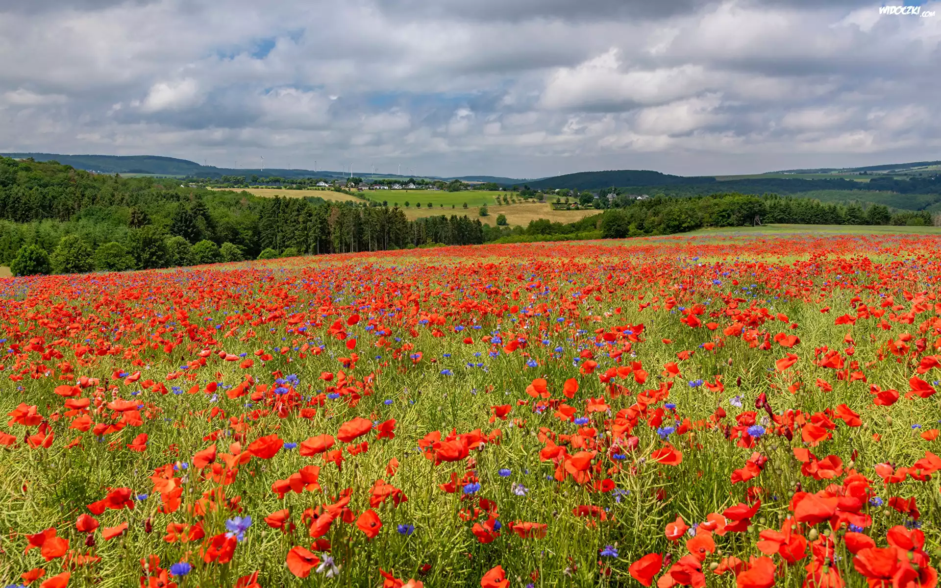 Pole, Łąka, Maki, Chabry, Las, Niebo