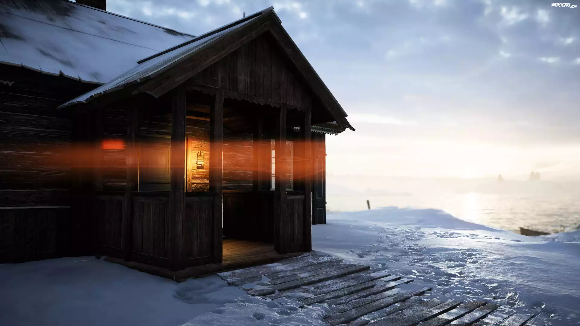 Zdjęcia, Drewniana, Chata, Dom, Zima, Śnieg, Lampa naftowa