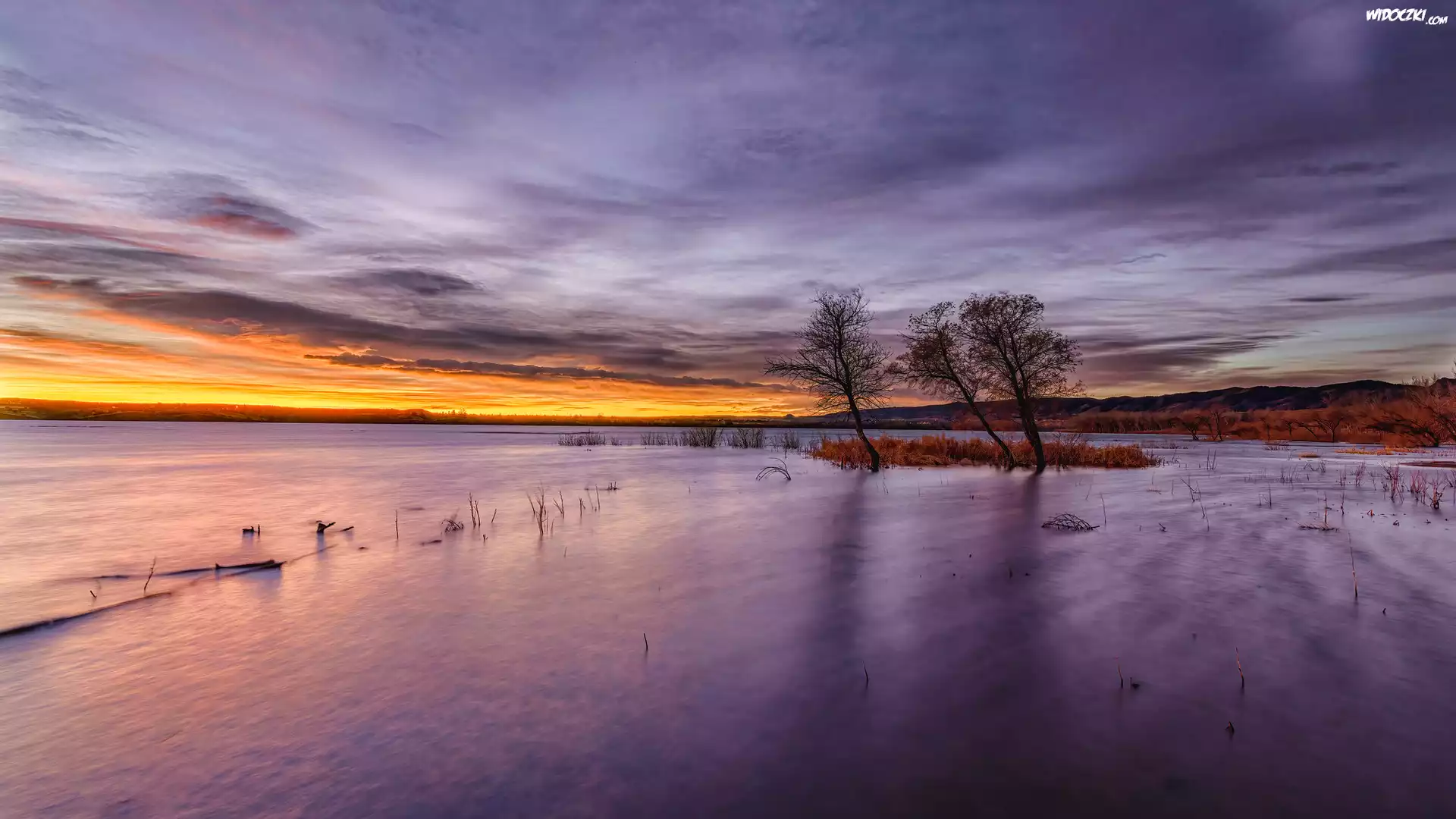Stany Zjednoczone, Kolorado, Chatfield State Park, Jezioro, Chatfield Lake, Drzewa, Chmury, Wschód słońca |