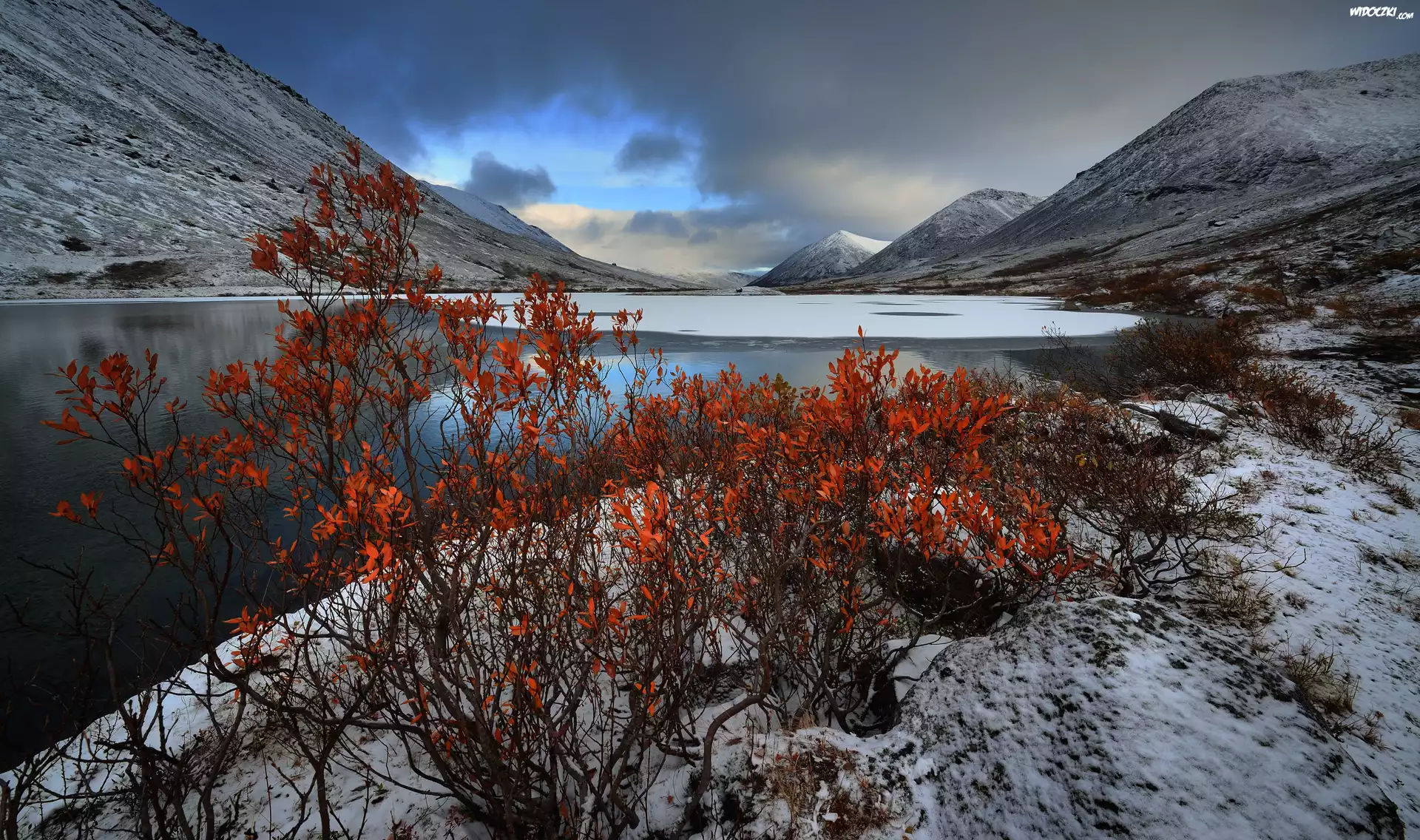 Zdjęcia, Góry Chibiny, Zima, Krzewy, Jezioro, Półwysep Kolski, Rosja