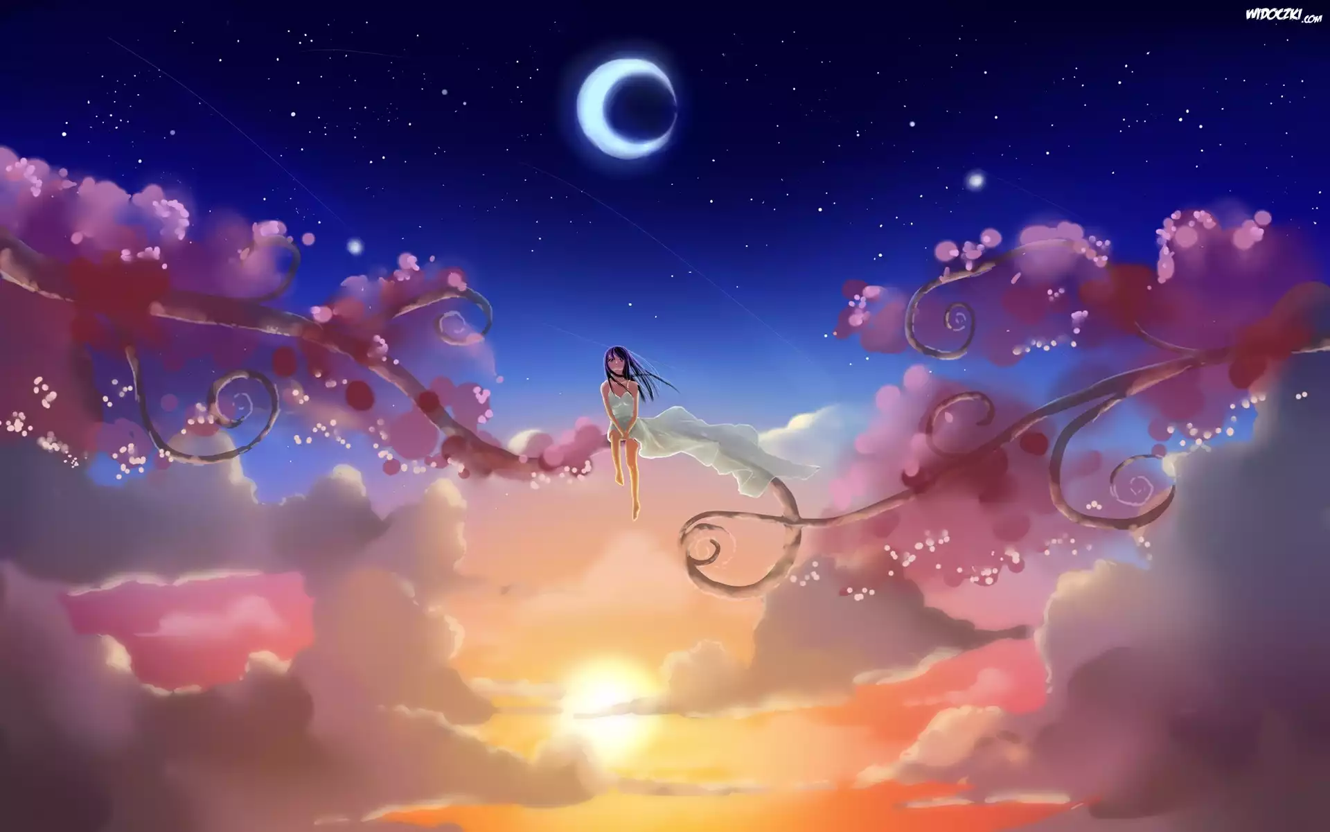 Chibionpu, Dziewczyna, Księżyc, Chmury, Gałęzie