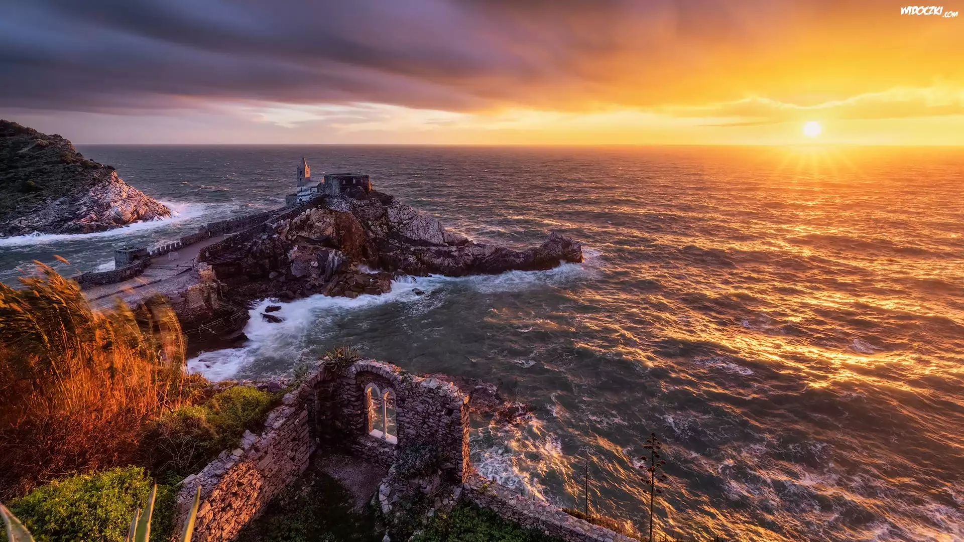 Chiesa di San Pietro, Kościół św Piotra, Wybrzeże, Morze Liguryjskie, Skały, Wschód słońca, Portovenere, Liguria, Włochy |