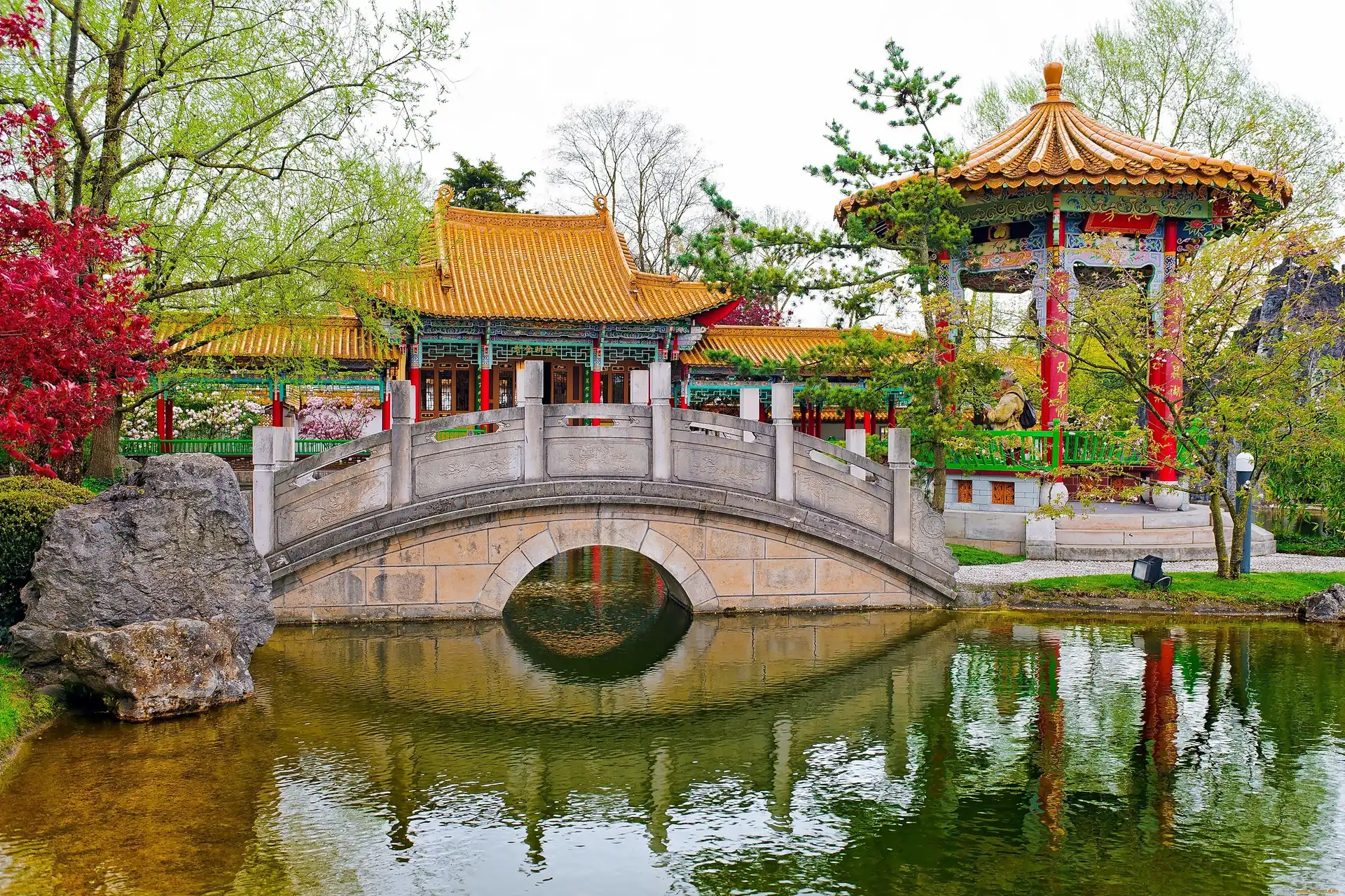 Chiński, Ogród, Staw, Mostek, Pawilon