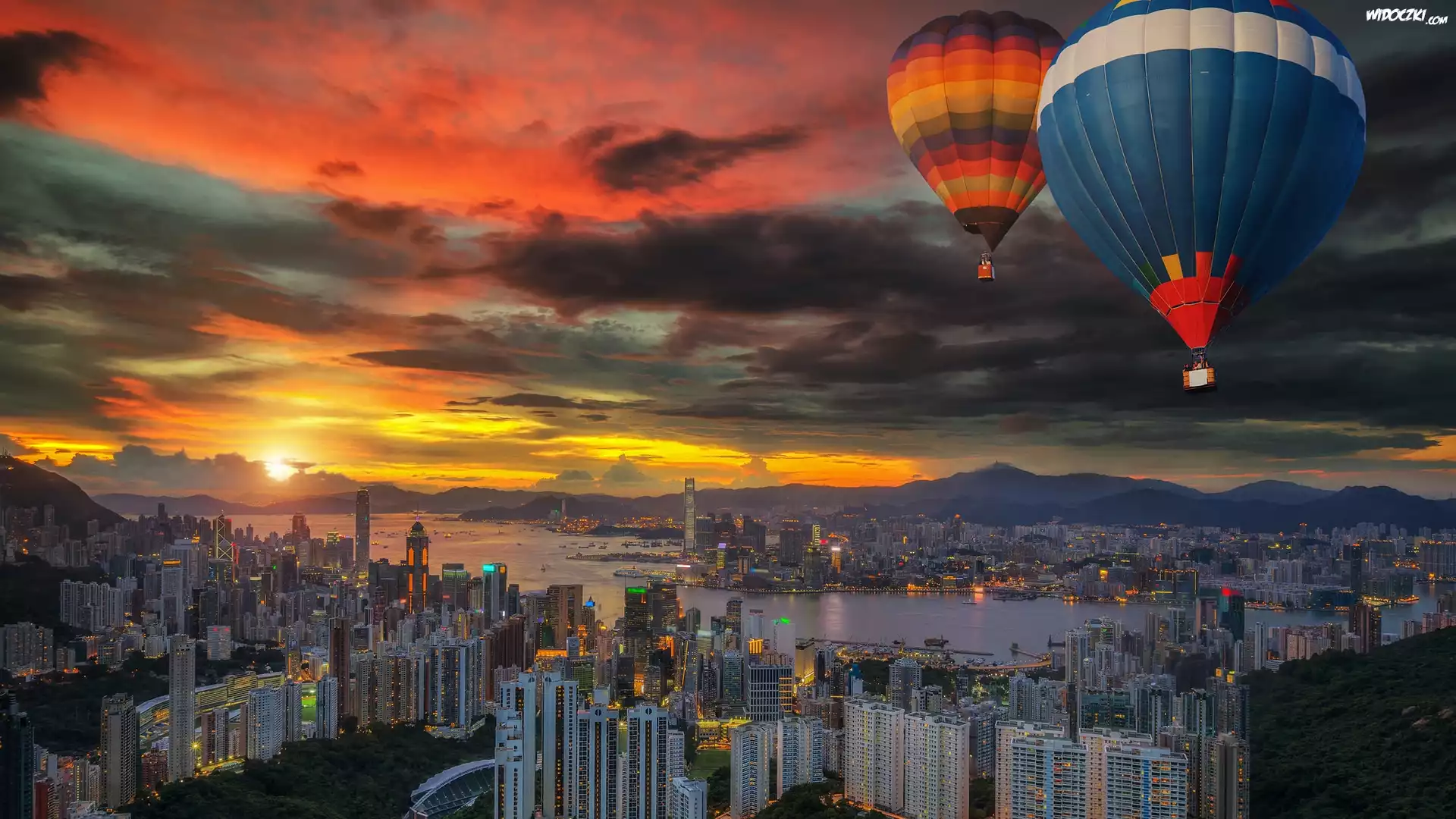 Zdjęcia, Hongkong, Chiny, Zatoka Wiktorii, Zachód słońca, Balony