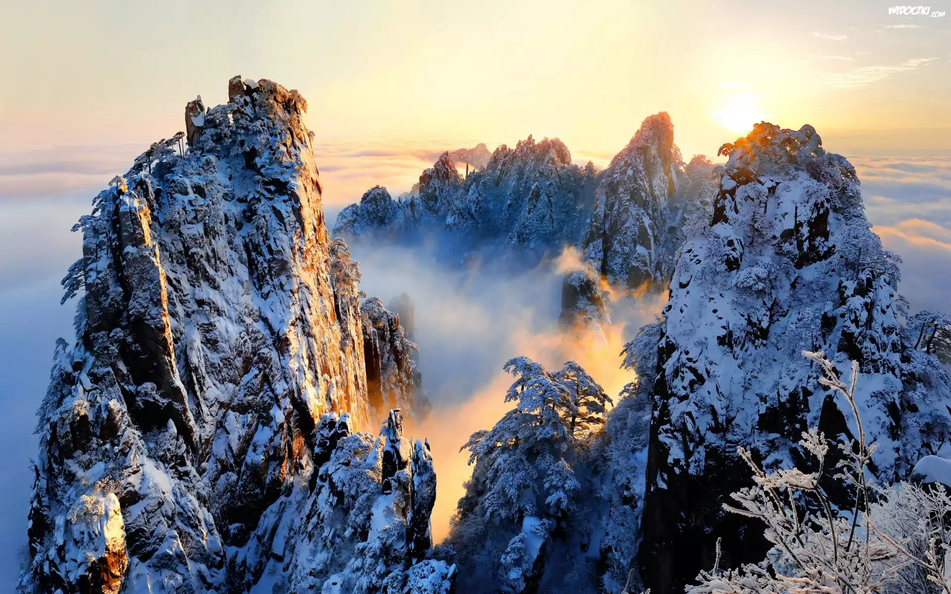 Zdjęcia, Chiny, Zima, Góry Huang Shan, Mgła