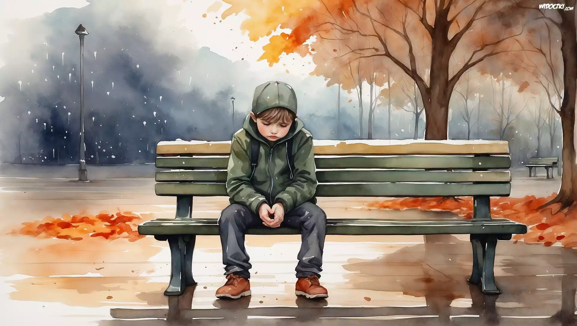 Dzieci, Chłopc, Smutny, Ławka, Park