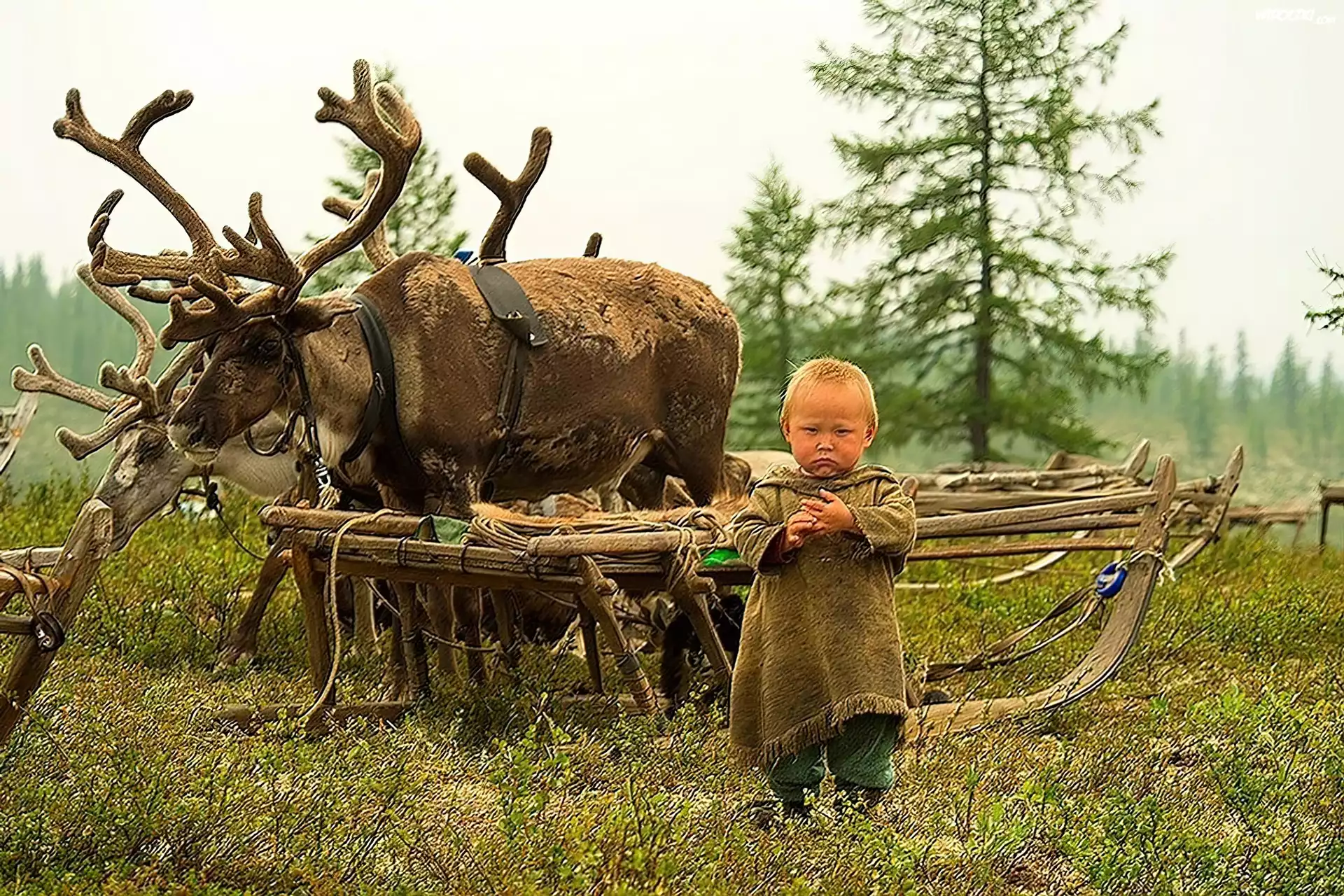 Chłopiec, Renifery, Las, Łąka