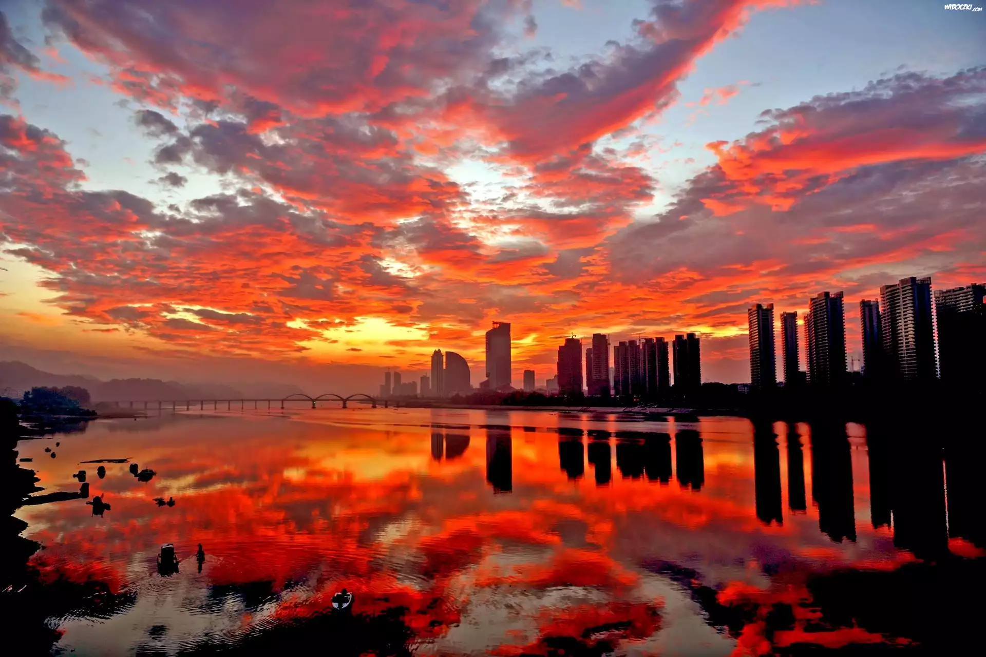 Drapacze Chmur, Chmury, Zachód Słońca, Morze, Niebo, Most