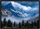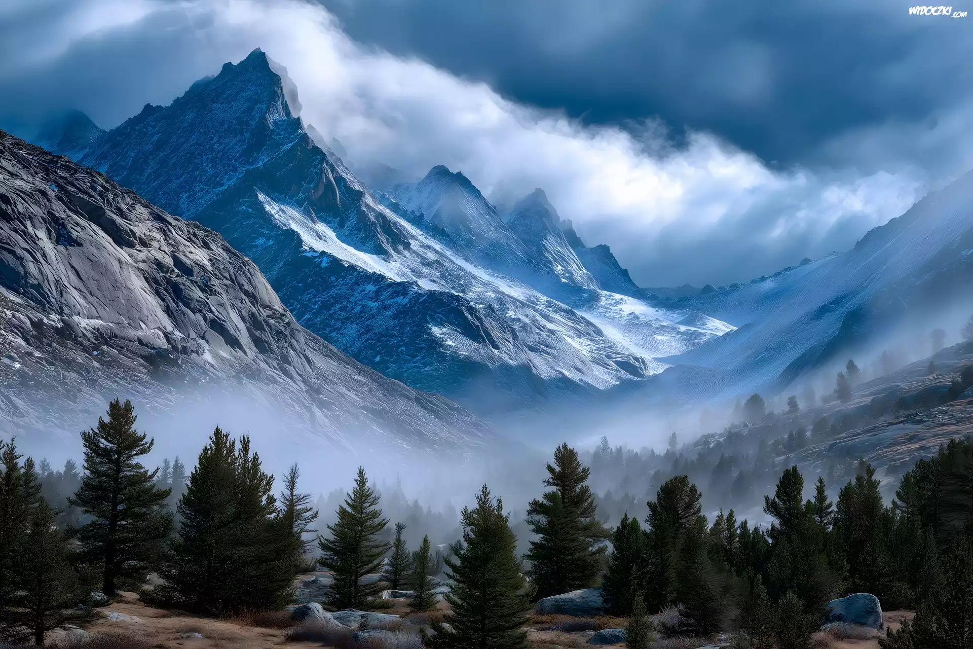 Zdjęcia, Zima, Góry, Drzewa, Chmury, Grafika AI