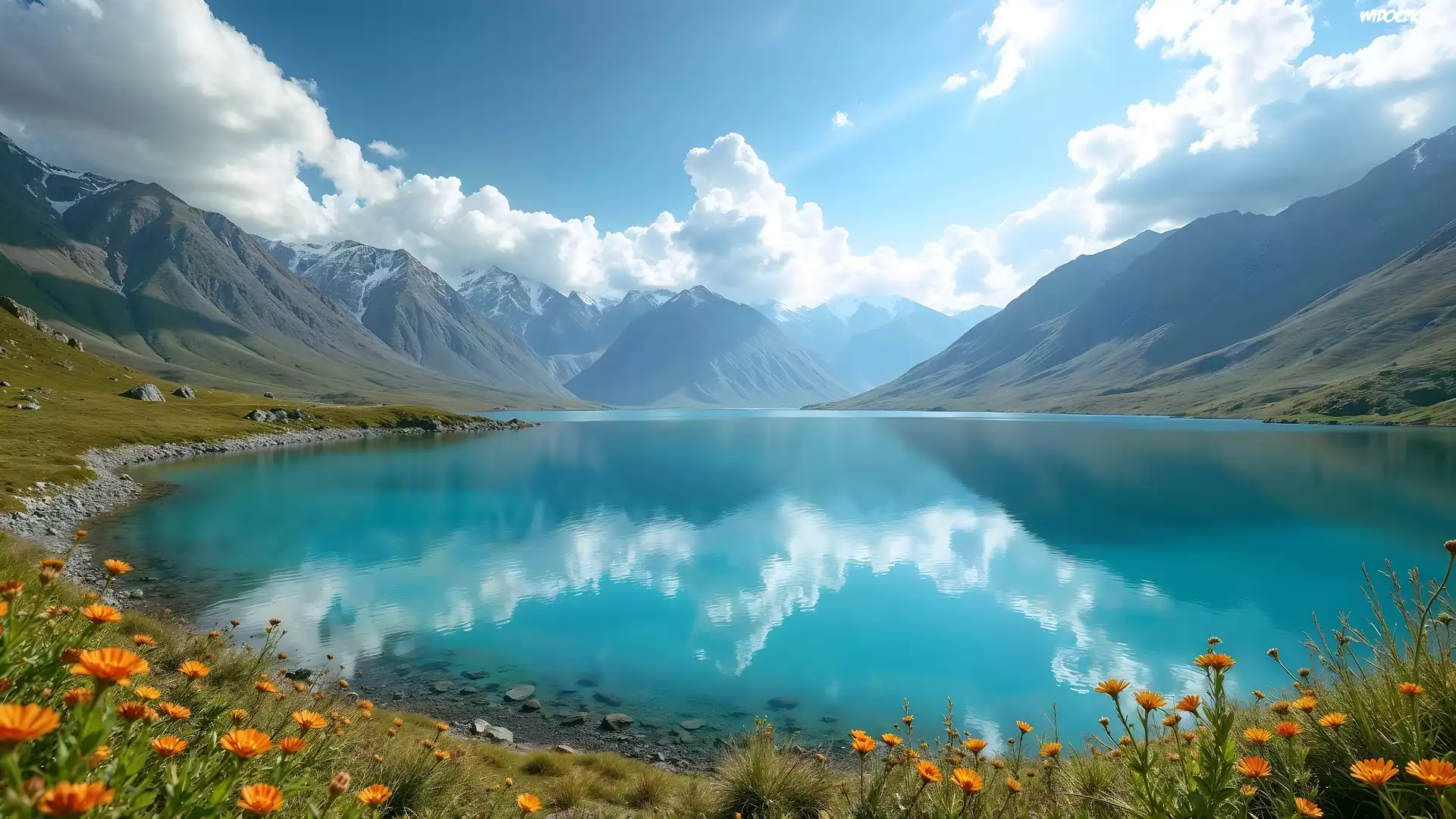 Góry, Jezioro, Kwiaty, Chmury, Odbicie, AI