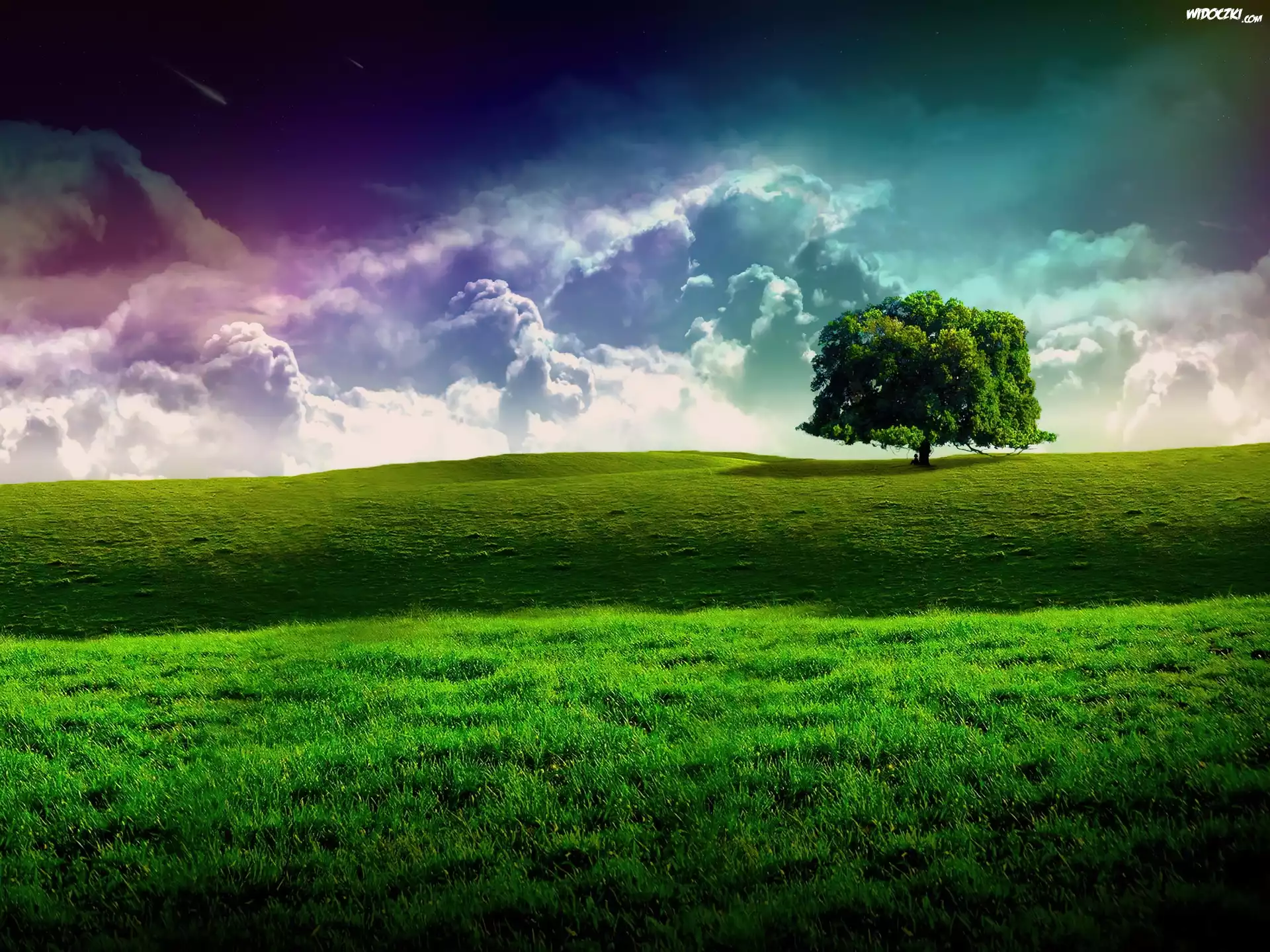 Zdjęcia, Chmury, Samotne, Drzewo, Łąka, Trawa
