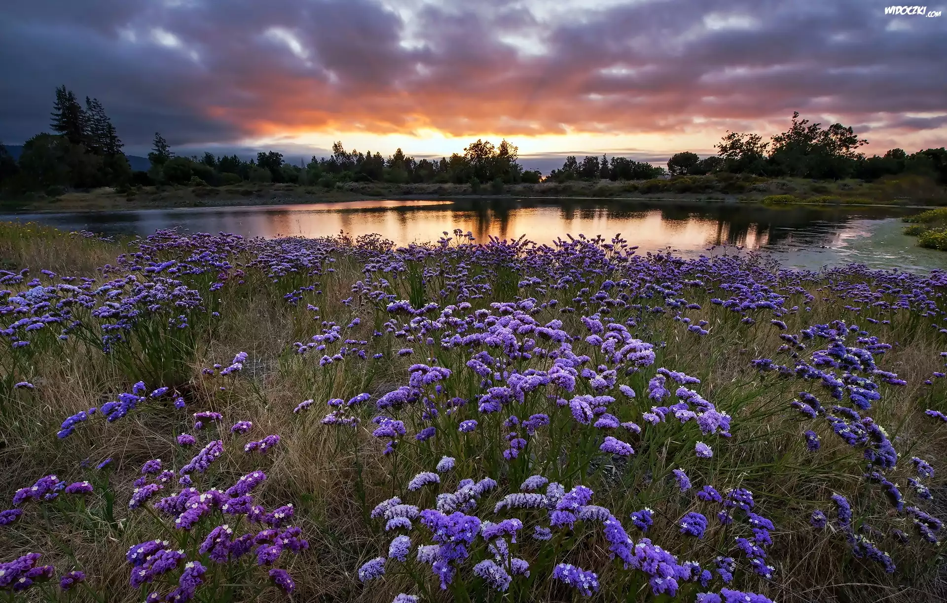 Chmury, Zachód, Słońca, Łąka, Jezioro