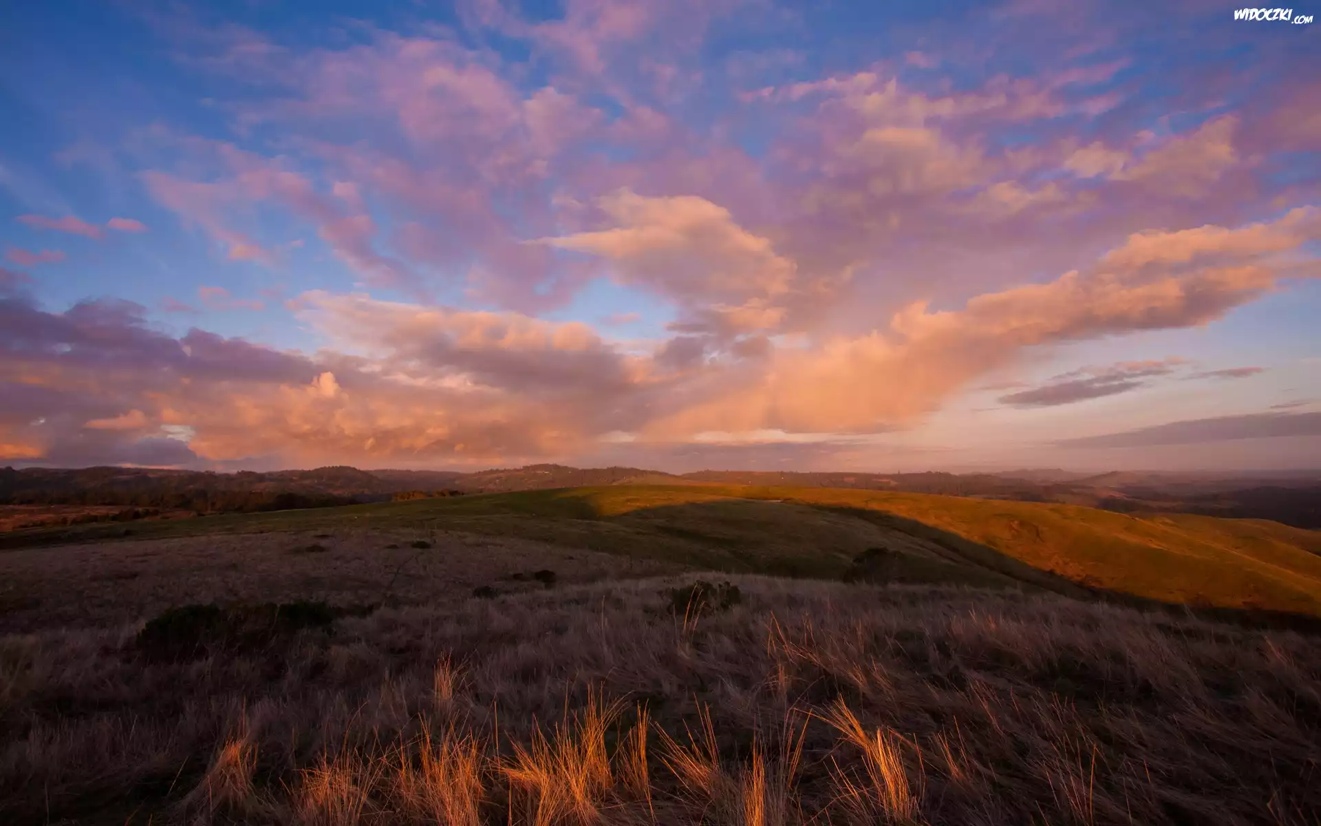 Zdjęcia, Łąka, Chmury, Wzgórza