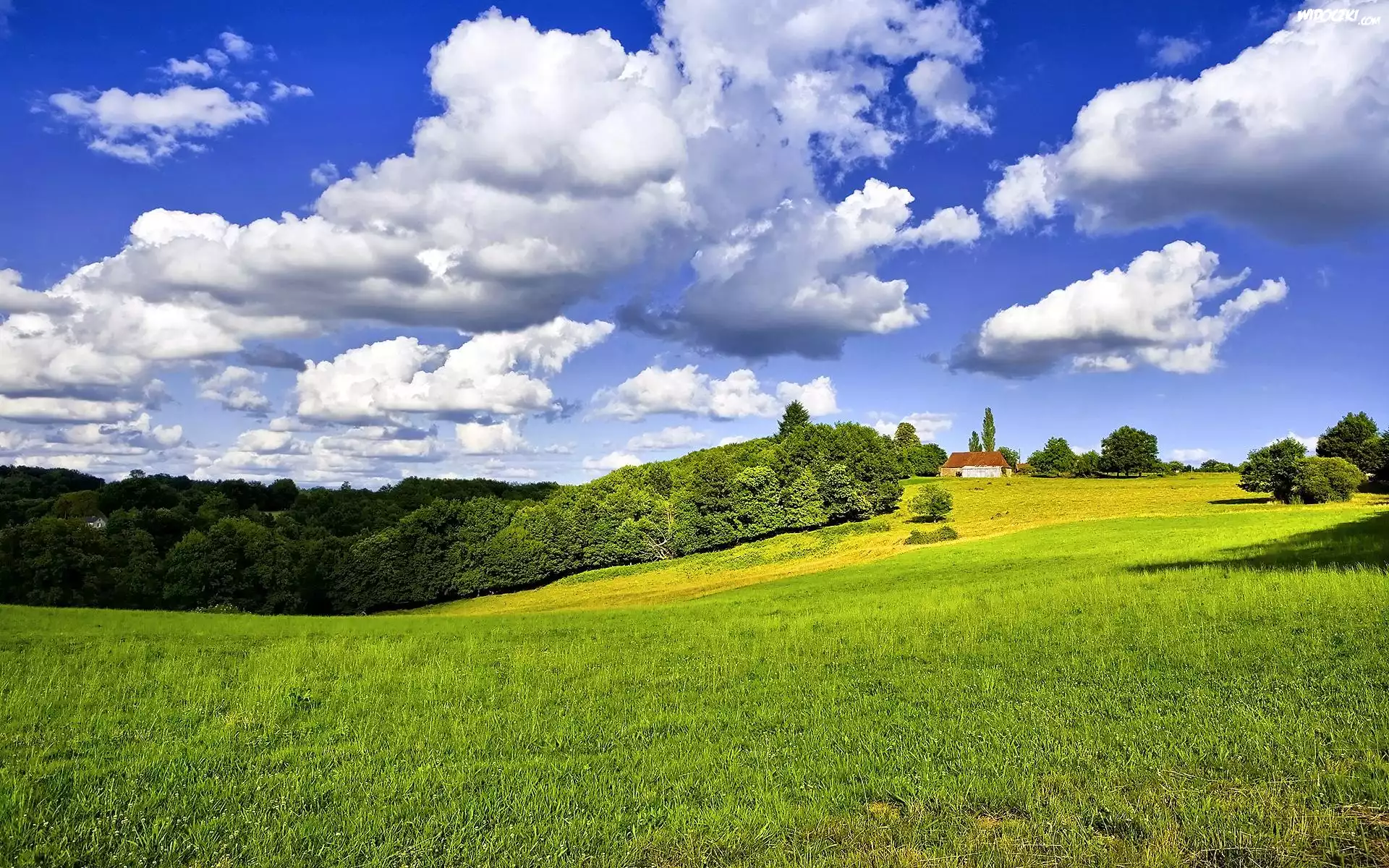 Zdjęcia, Łąki, Chmury, Wzgórza