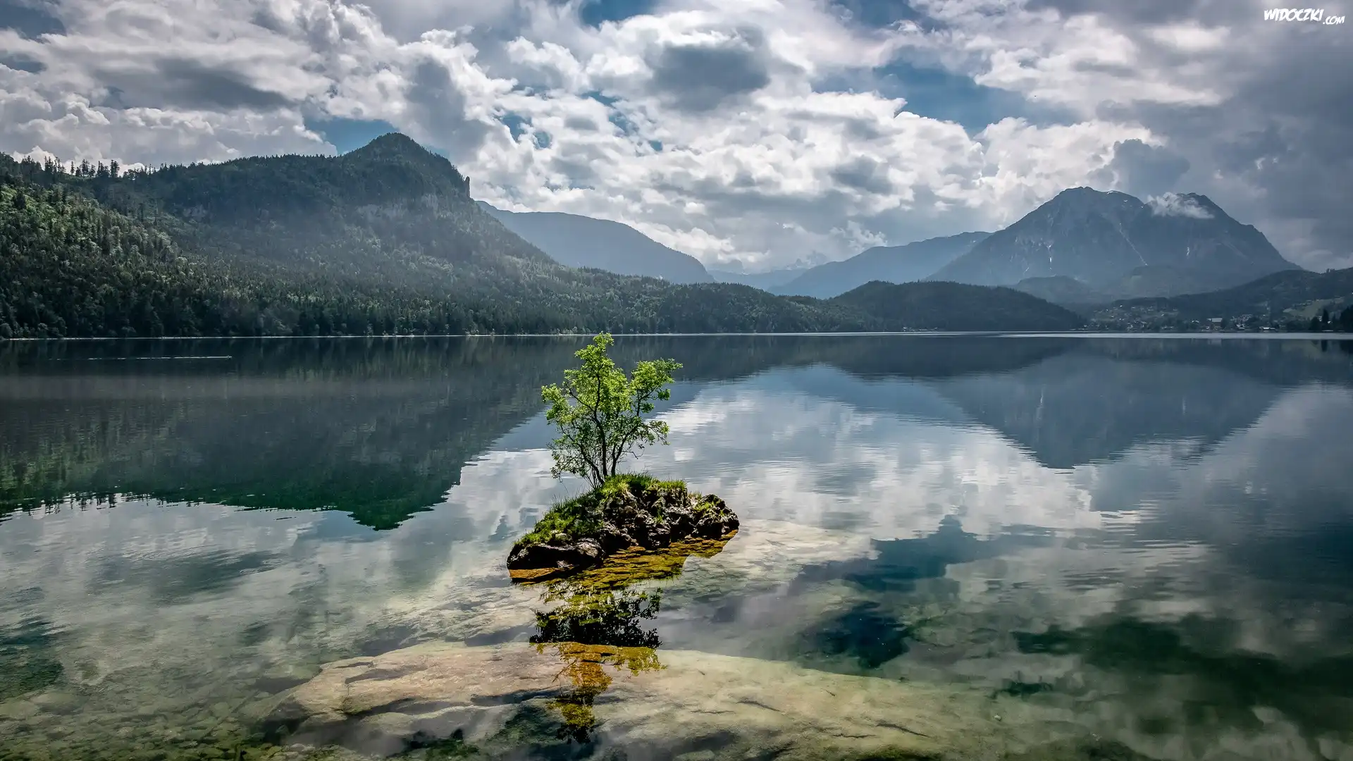 Zdjęcia, Austria, Styria, Altaussee, Góry, Las, Drzewa, Jezioro Altausseer, Chmury