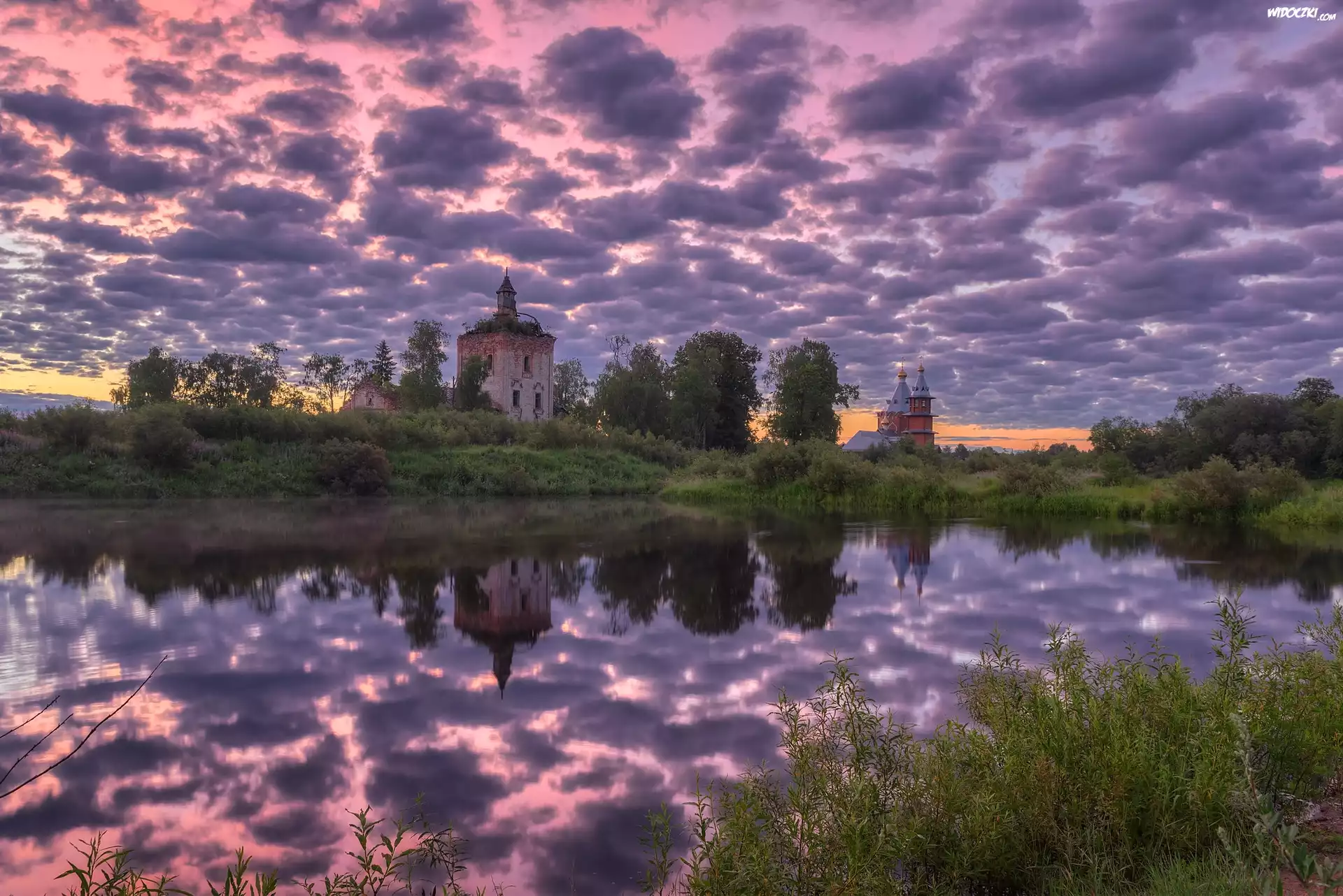Chmury, Niebo, Rzeka, Cerkiew, Rośliny, Drzewa, Ruina, Odbicie, Wieś Zaruchevskaya, Rejon wielski, Obwód archangielski, Rosja |