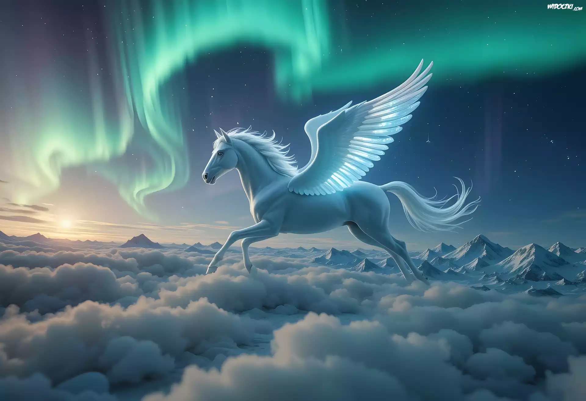 Zdjęcia, Fantasy, Koń, Biały, Skrzydła, Pegaz, Zorza polarna, Chmury