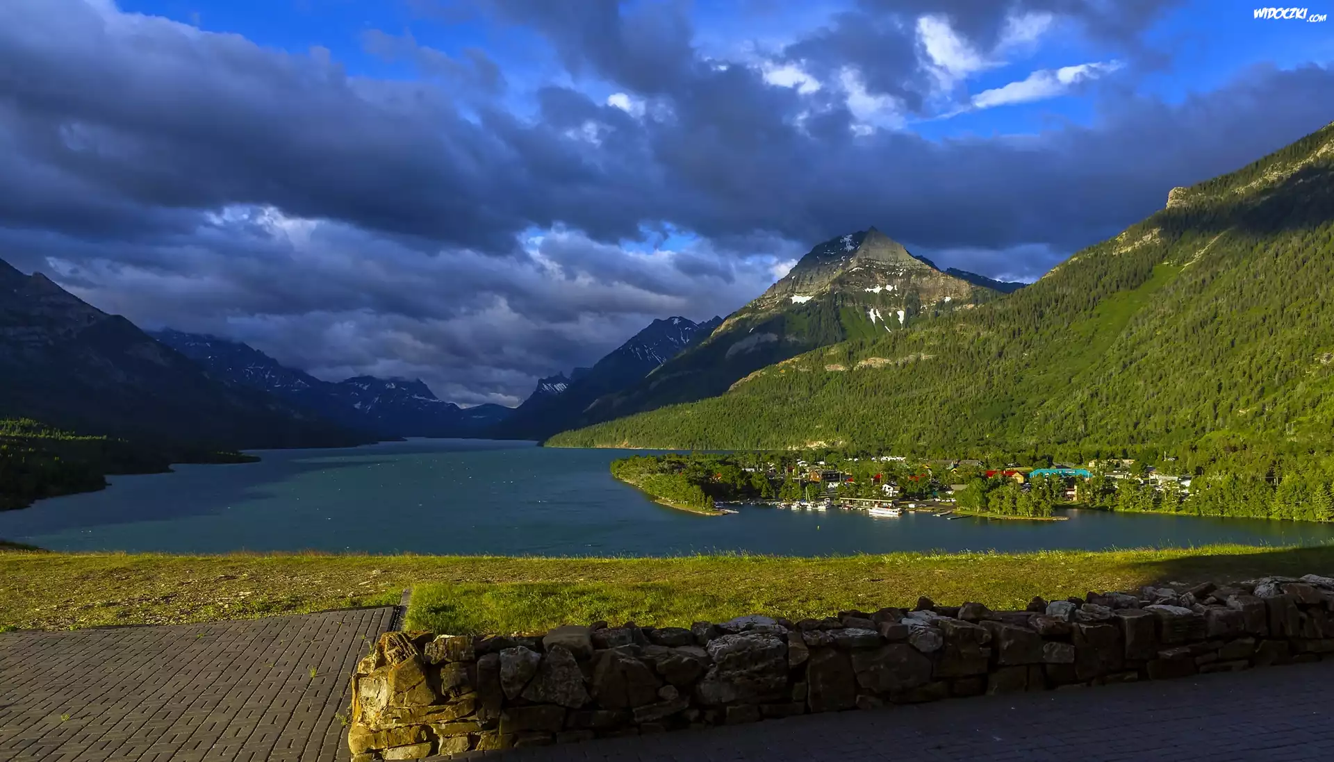 Chmury, Góry, Jezioro, Budynki, Kanada