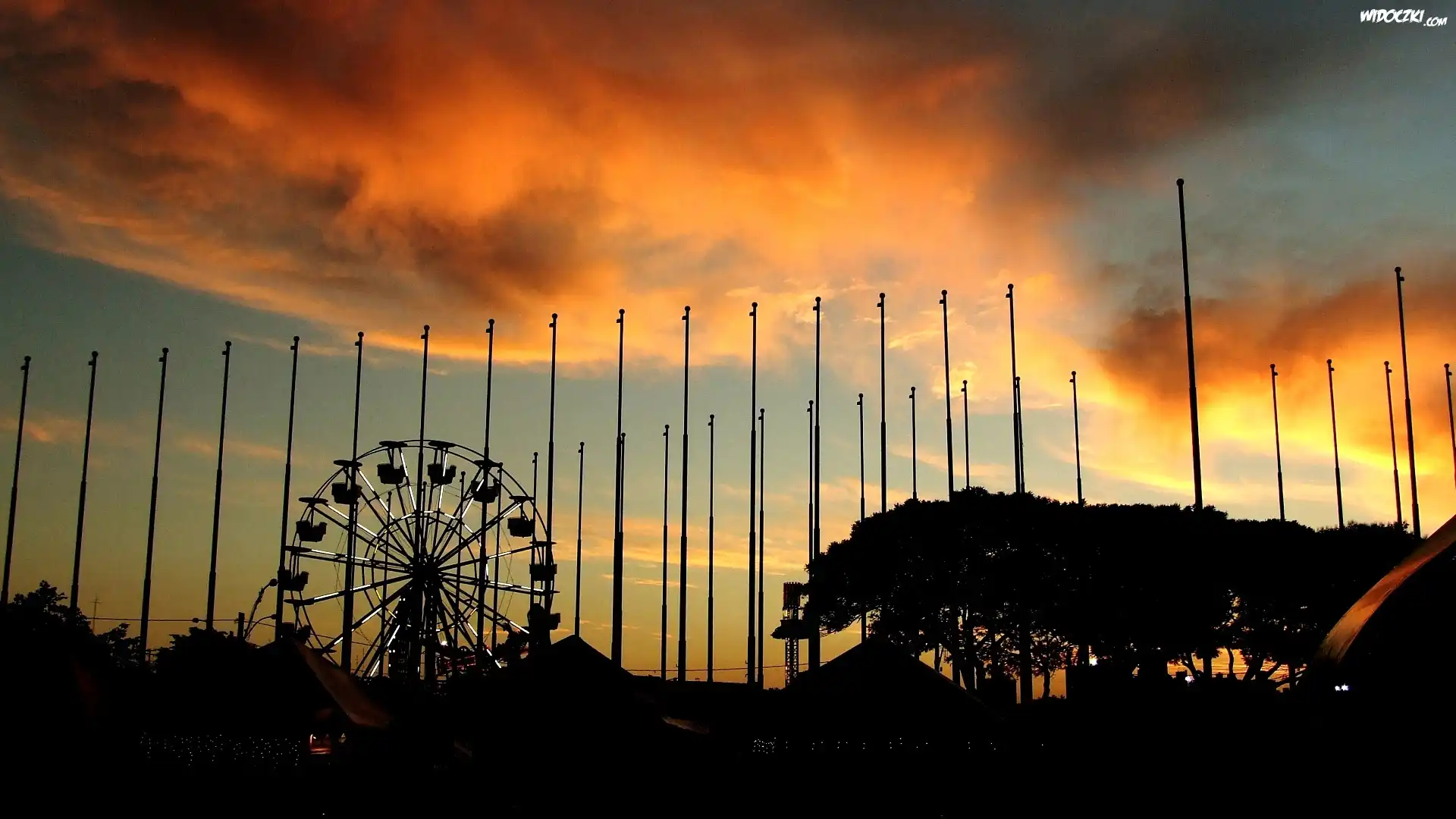 Chmury, Zachód, Słońca, Drzewa, Diabelski, Młyn