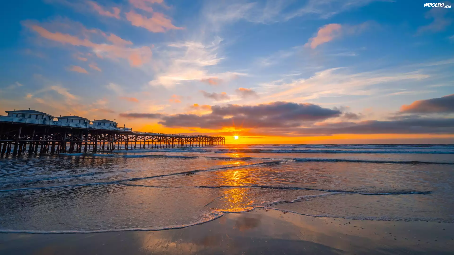 Zdjęcia, Stany Zjednoczone, Kalifornia, San Diego, Morze, Molo, Zachód słońca, Chmury