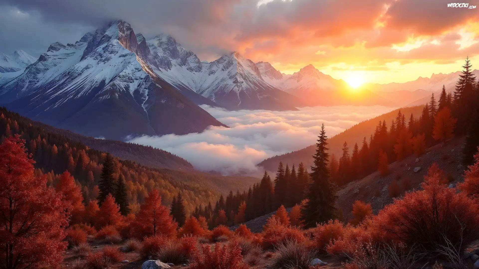 Jesień, Góry, Dolina, Mgła, Drzewa, Las, Niebo, Chmury