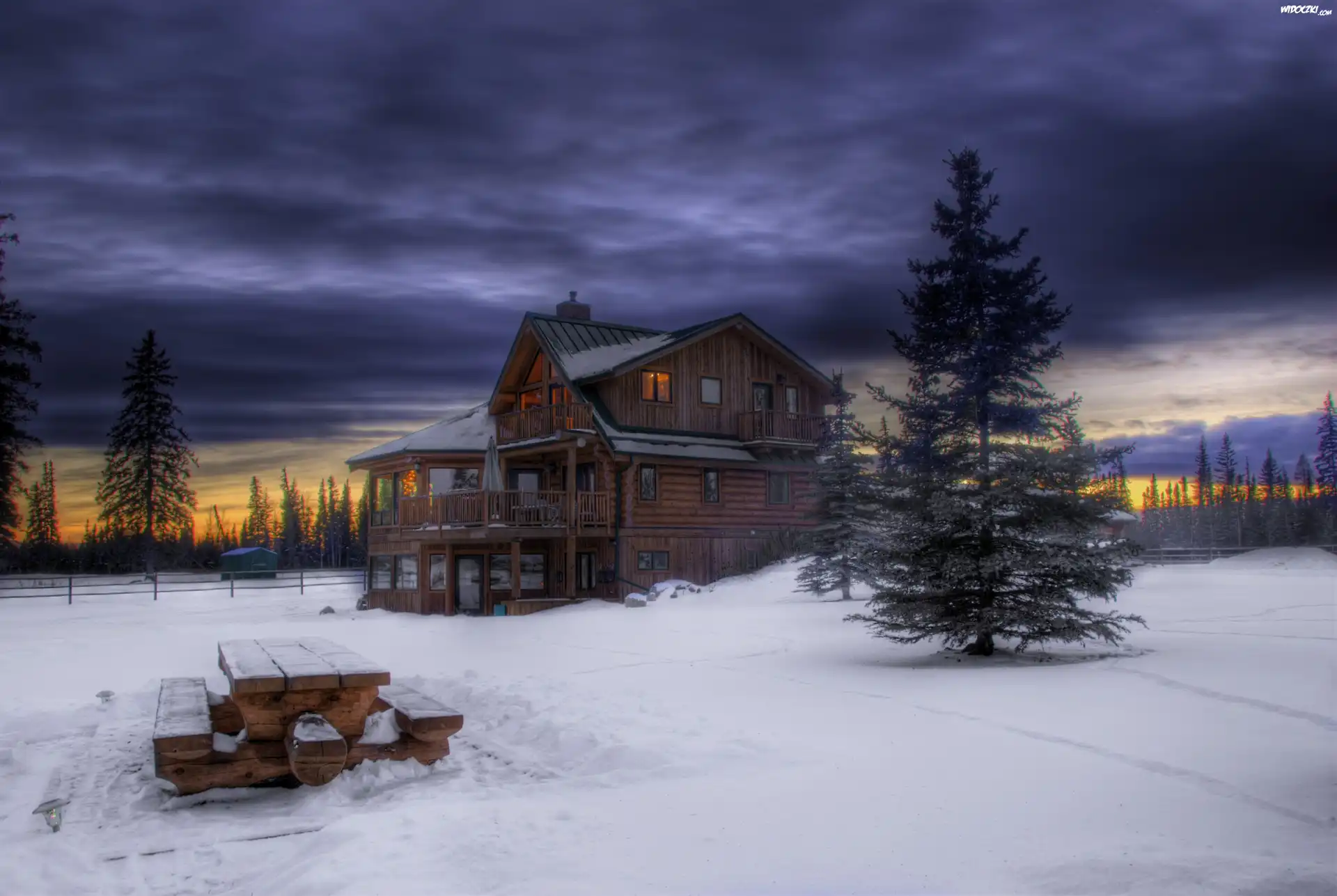 Chmury, Śnieg, Ławeczka, Dom, Choinki