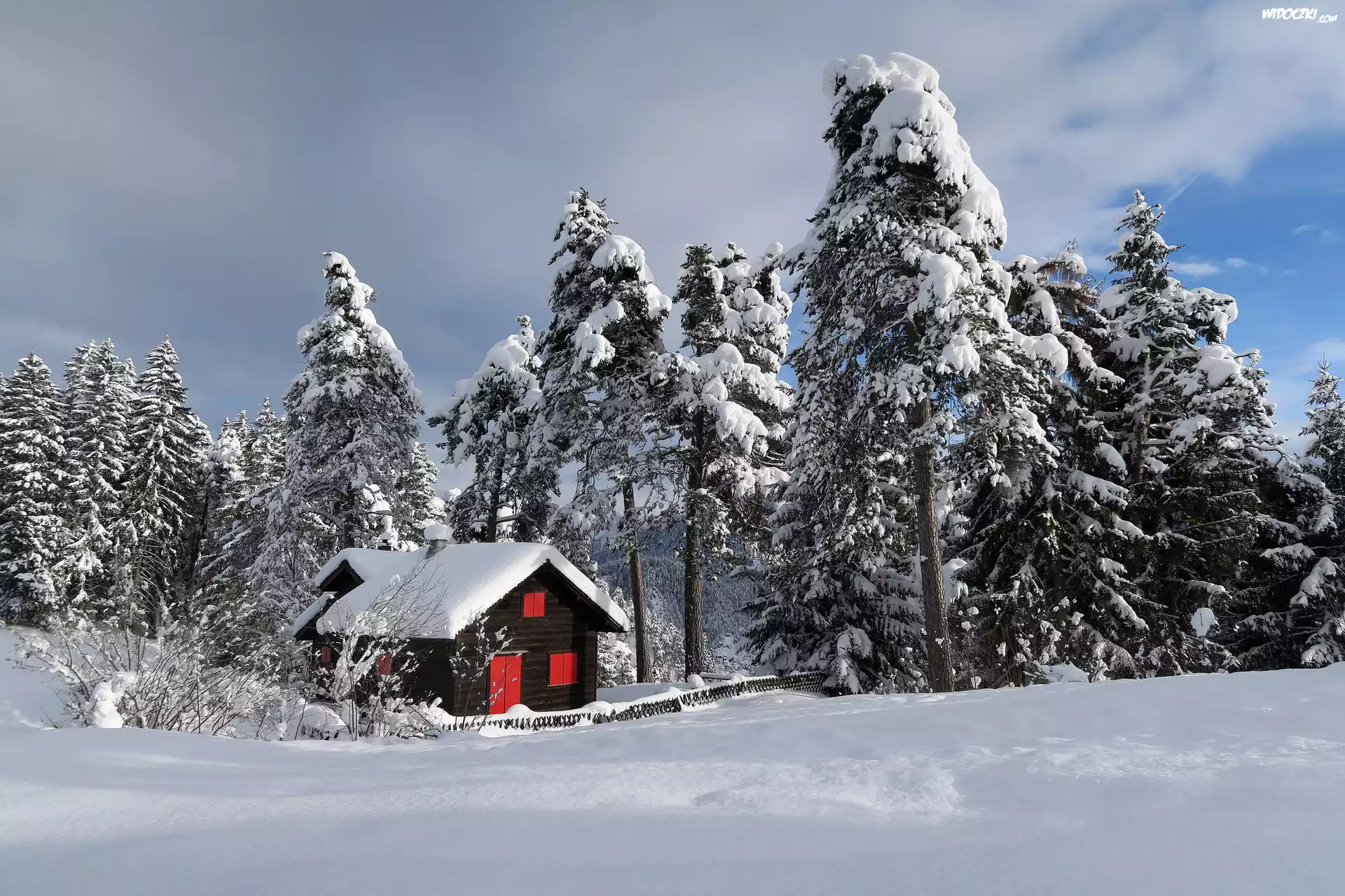 Zdjęcia, Zima, Las, Dom, Czerwone Drzwi, Okna, Ośnieżone, Drzewa, Chmury