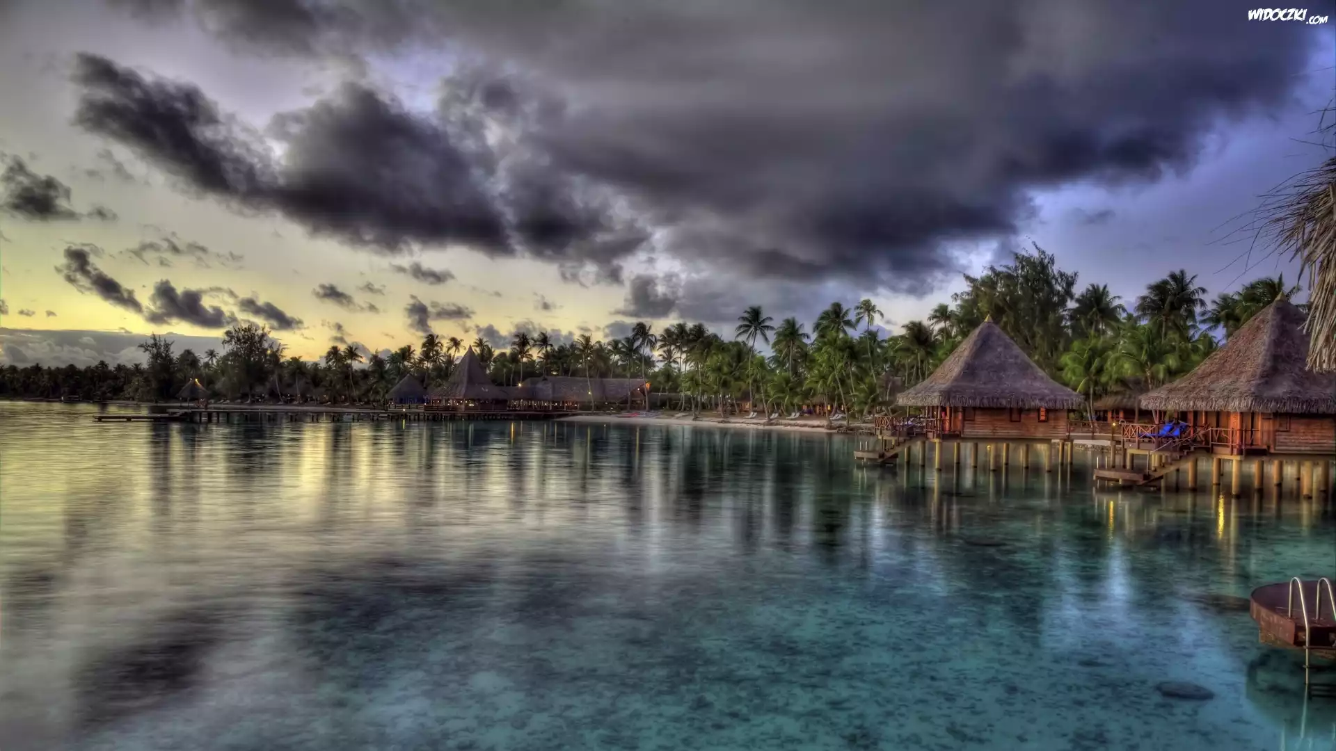 Zdjęcia, Chmury, Morze, Domki, Palmy