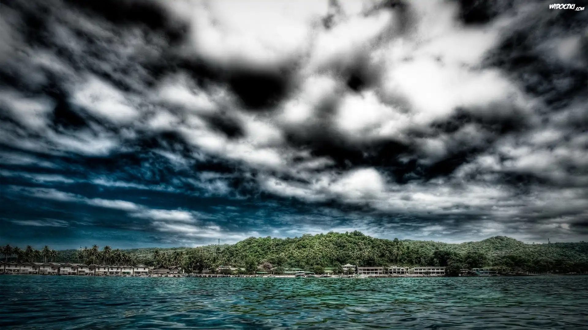 Zdjęcia, Chmury, Morze, Wybrzeże, Domki, Plażowe
