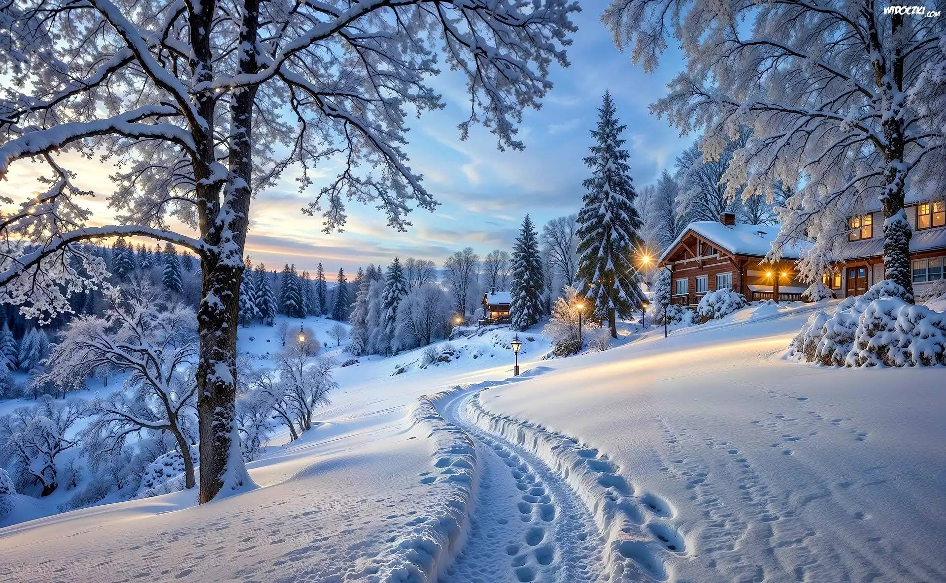Zima, Drzewa, Droga, Śnieg, Domy, Światła, Ślady, Chmury
