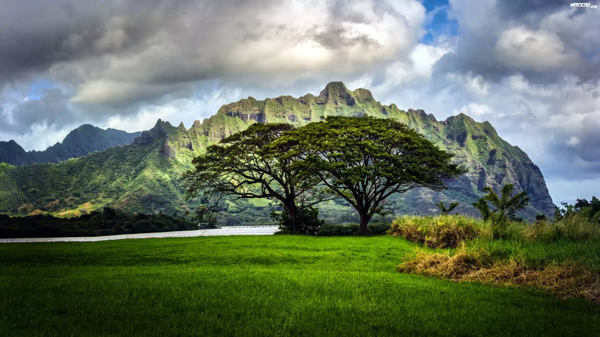 Zdjęcia, Chmury, Góry, Drzewa, Trawa