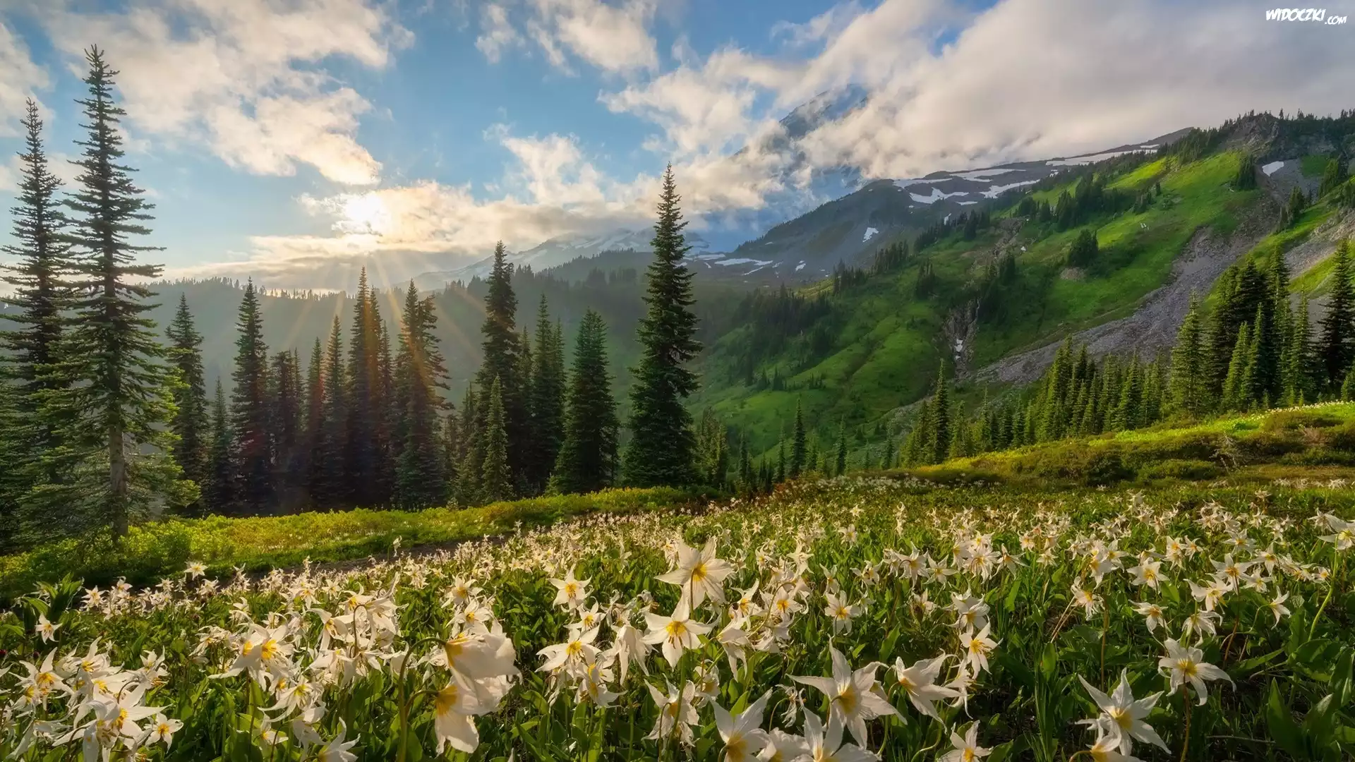 Zdjęcia, Góry, Las, Drzewa, Łąka, Kwiaty, Psizęby, Promienie słońca, Chmury