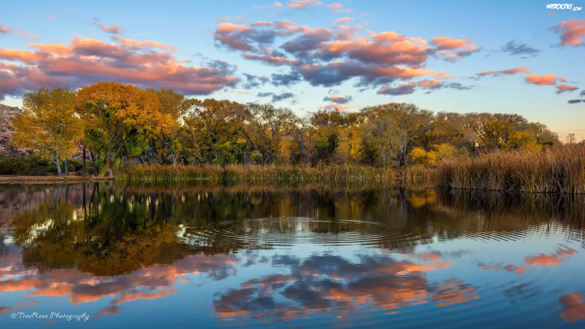 Zdjęcia, Drzewa, Jezioro, Odbicie, Chmury
