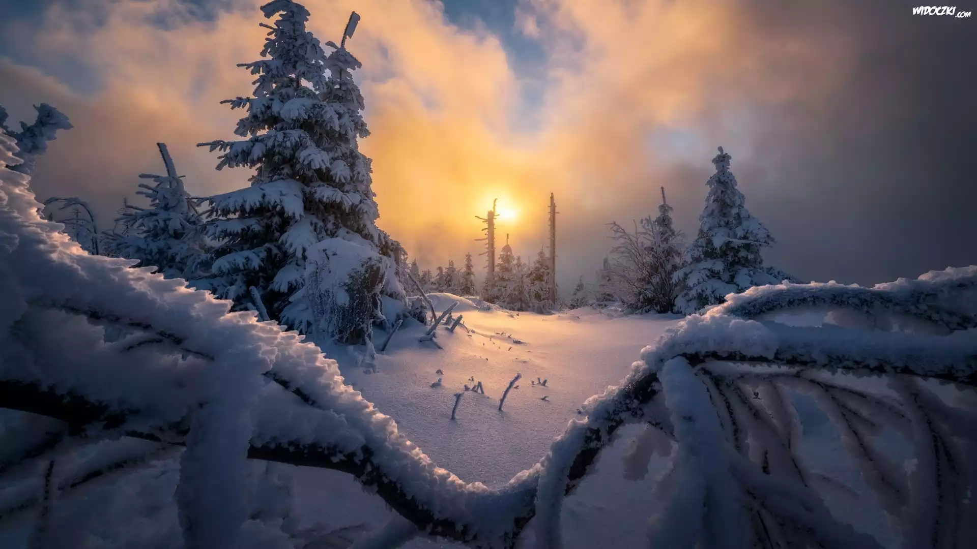 Zdjęcia, Zima, Ośnieżone, Drzewa, Skały, Wschód słońca, Mgła, Chmury