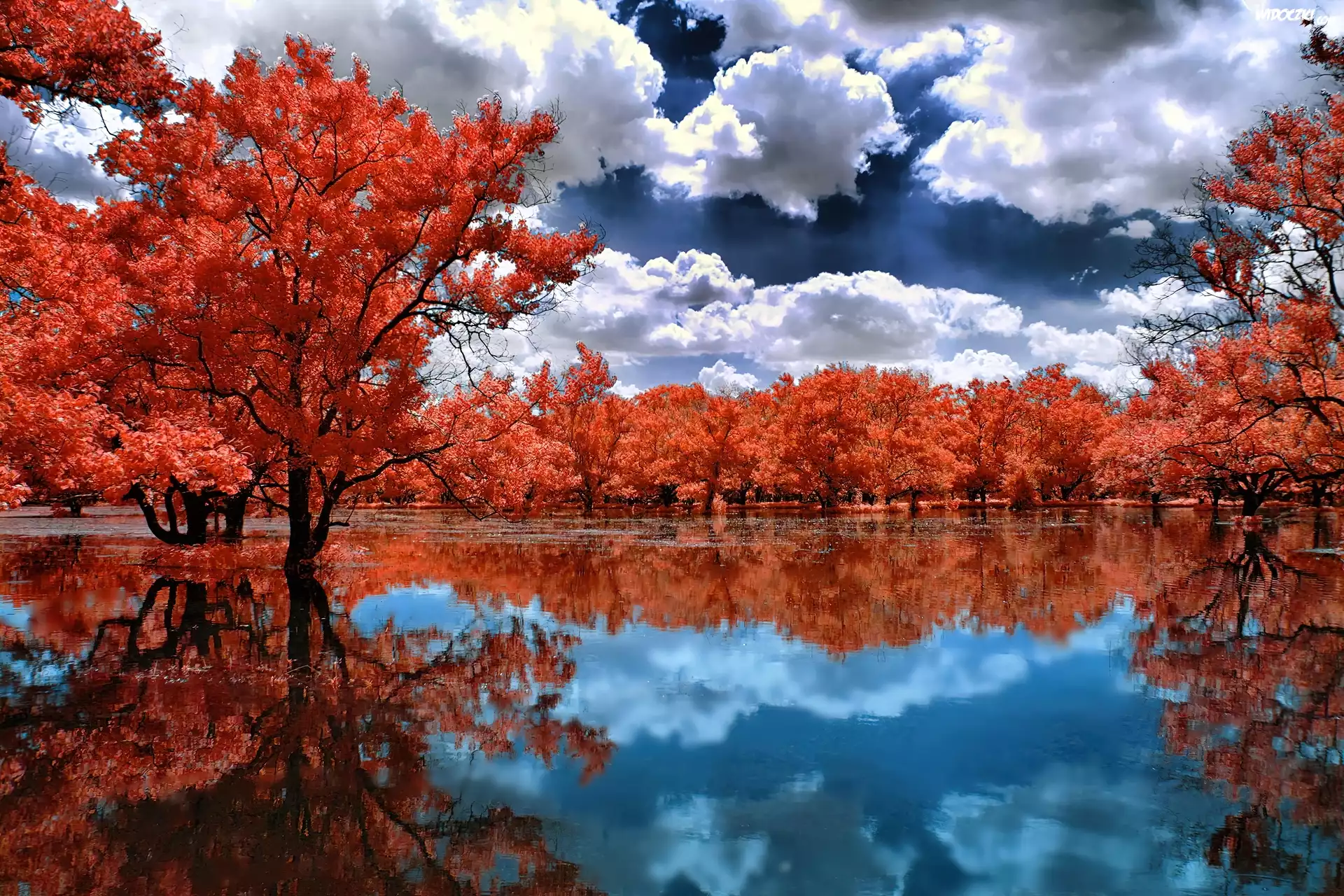 Chmury, Pomarańczowe, Drzewa, Jezioro