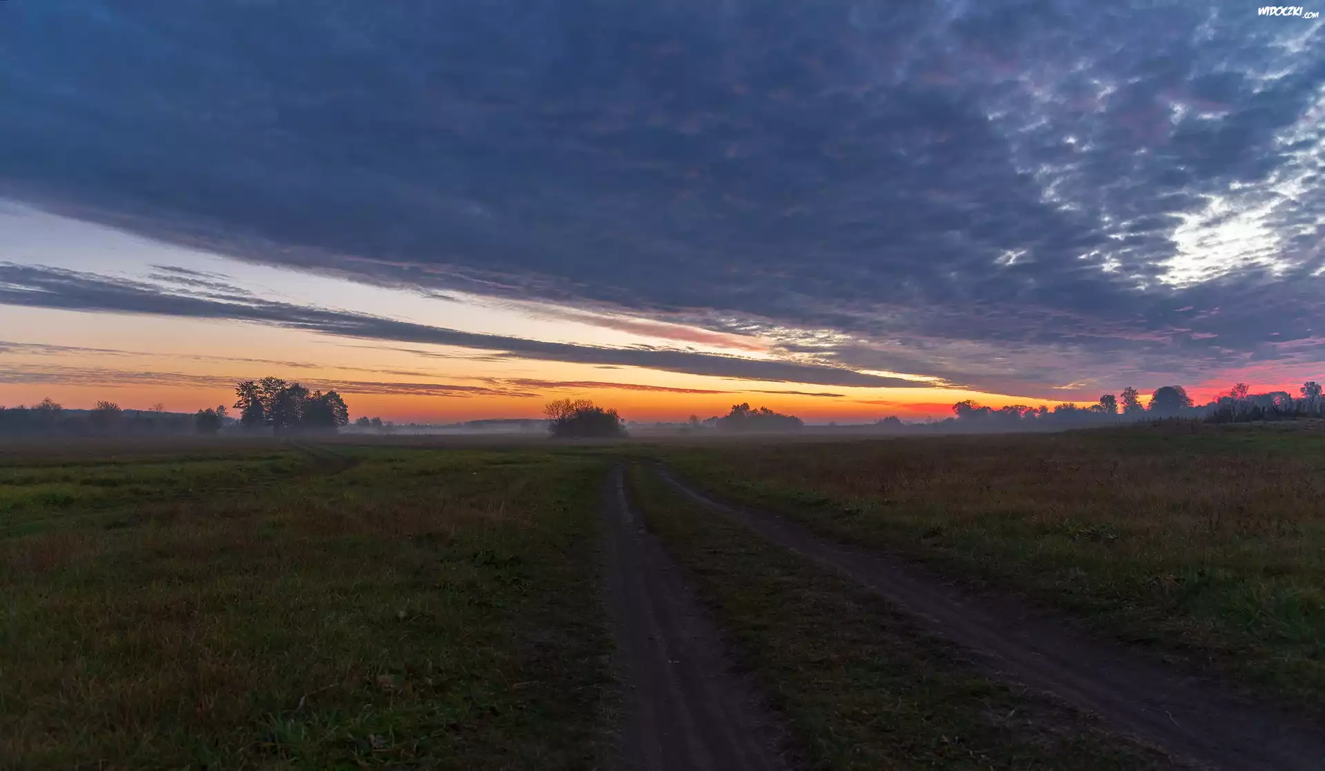 Poranek, Chmury, Wschód słońca, Ląki, Drogi, Mgła, Drzewa