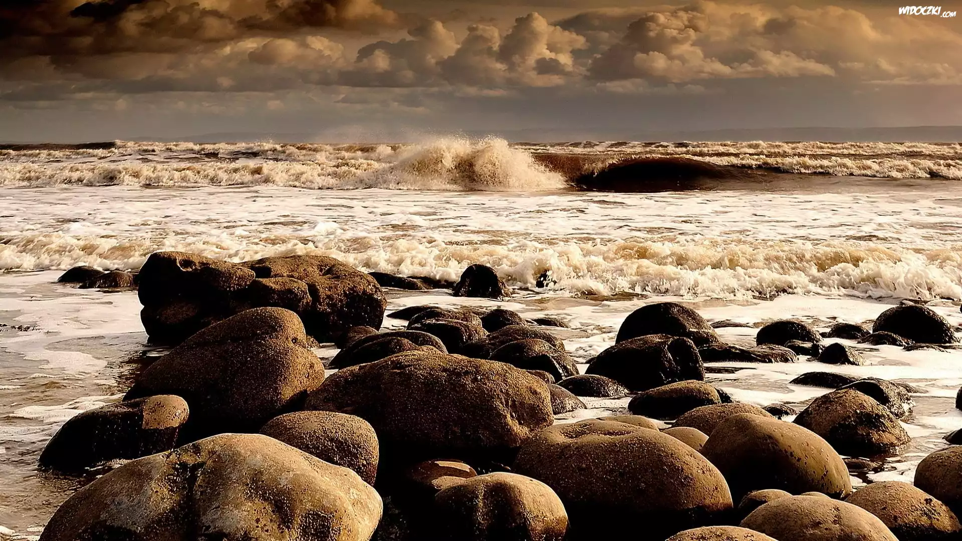 Chmury, Morze, Fale, Kamienie