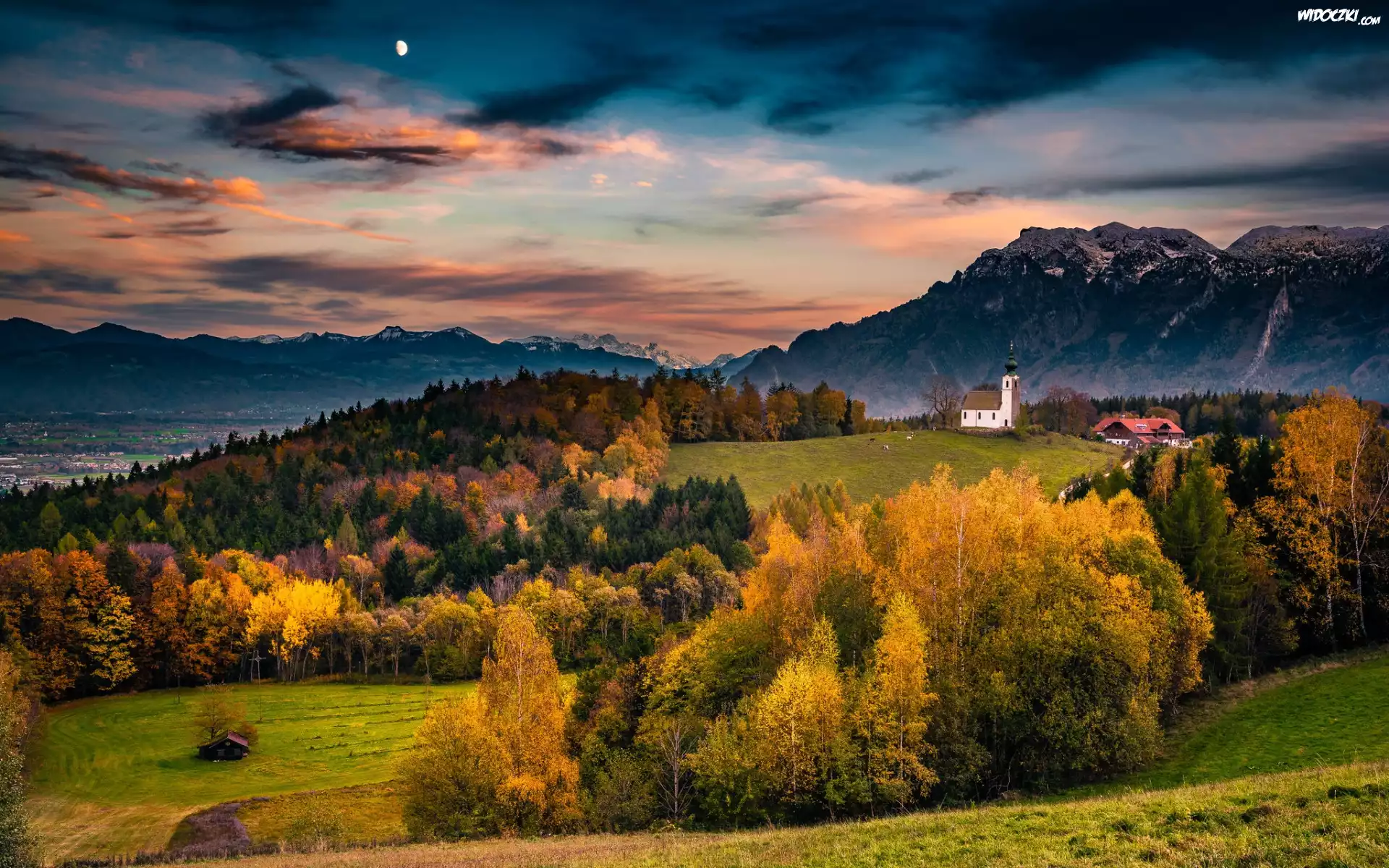 Zdjęcia, Jesień, Las, Góry, Drzewa, Polana, Dom, Wzgórze, Kościół, Niebo, Chmury, Księżyc, Wieczór