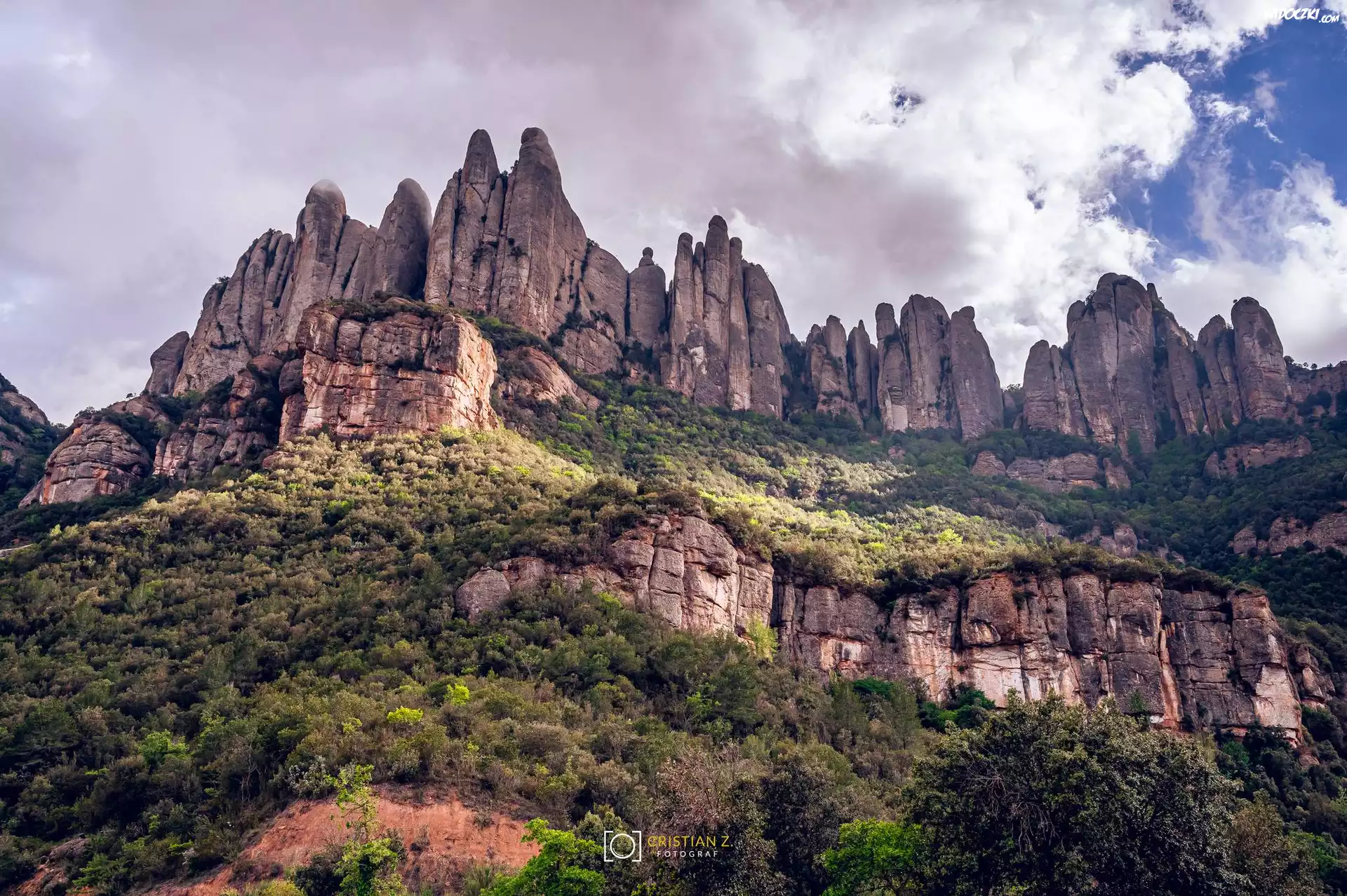Zdjęcia, Hiszpania, Katalonia, Góry, Montserrat, Skały, Las, Drzewa, Chmury